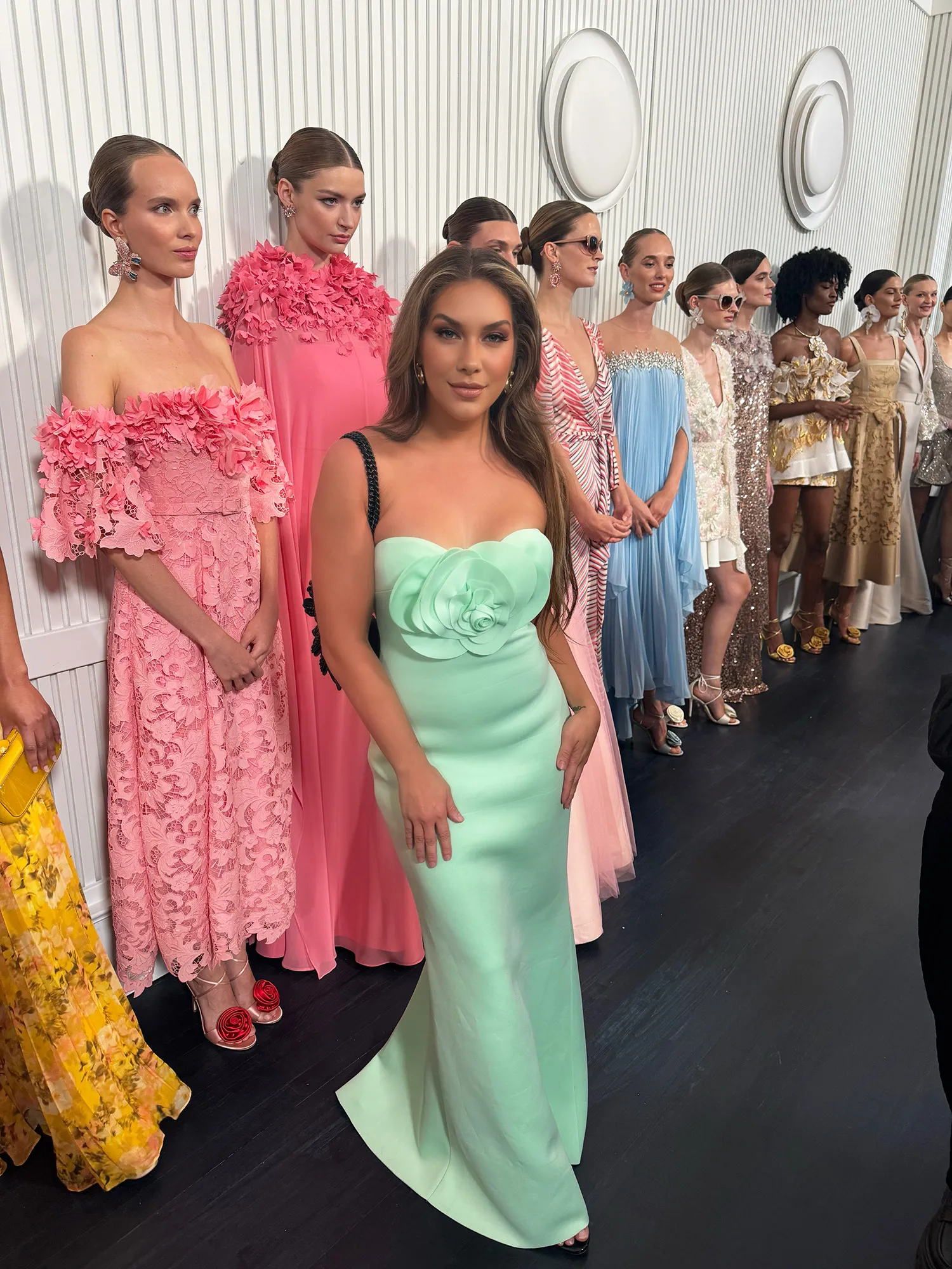 For the Badgley Mischka spring 2025 show, Holker dazzled in a teal strapless dress featuring a large floral on her chest and a floor-length skirt. She teamed the look with strappy black heels and a matching leather purse.