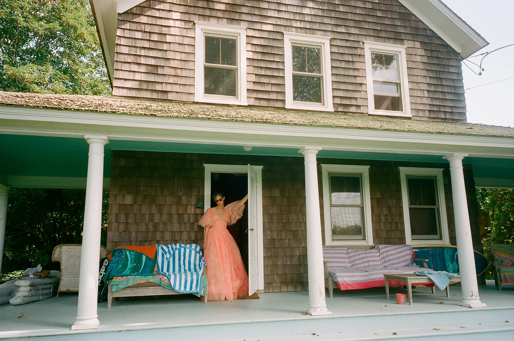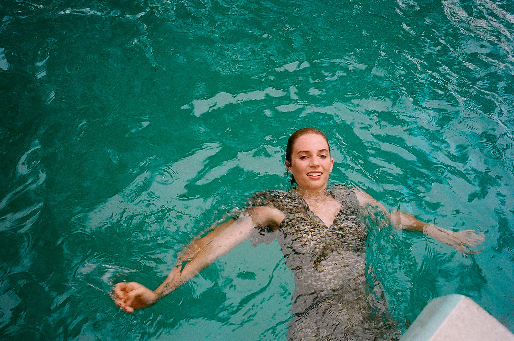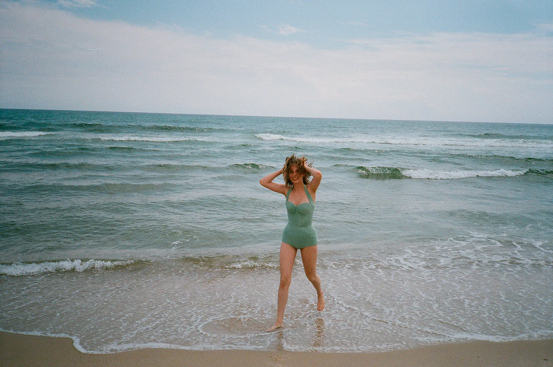The freckle-faced 20-year-old model and actress rocks minimal hair and makeup in the snaps as she frolics on the beach in retro-inspired bathing suits, takes a swim in a Liberty-print muumuu and casually lounges in taffeta gowns with the understated glamour of the collection in mind. “She’s vivacious and full of life and character,” Posen says of Hawke. “I thought a female photographer shooting a young woman and capturing the strength of the clothing despite it being very feminine and pretty was important.”