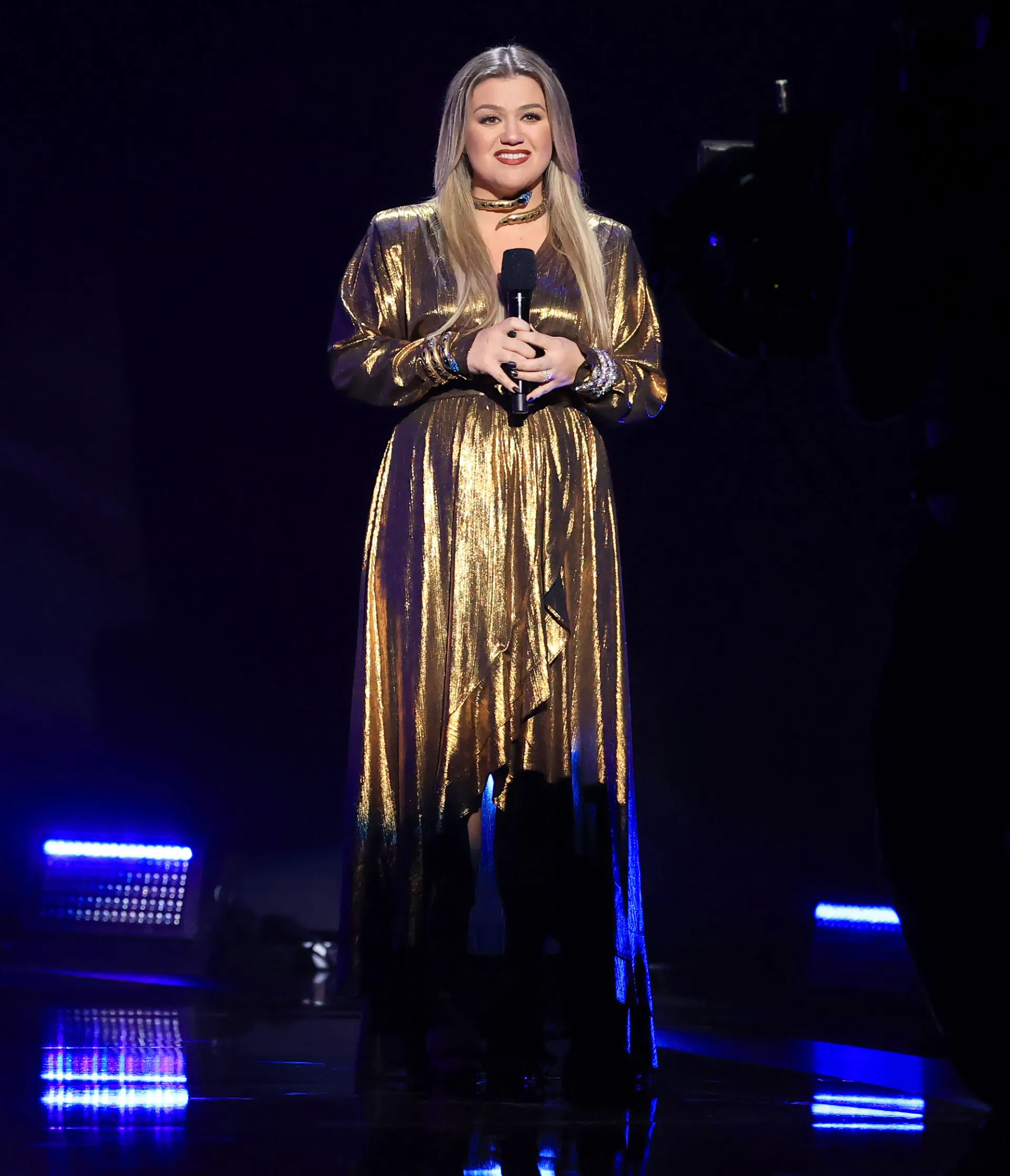 Clarkson was all about the drama, donning multiple shimmery outfits throughout the show, including a silver gown with fringe details along the hemline and sleeves.