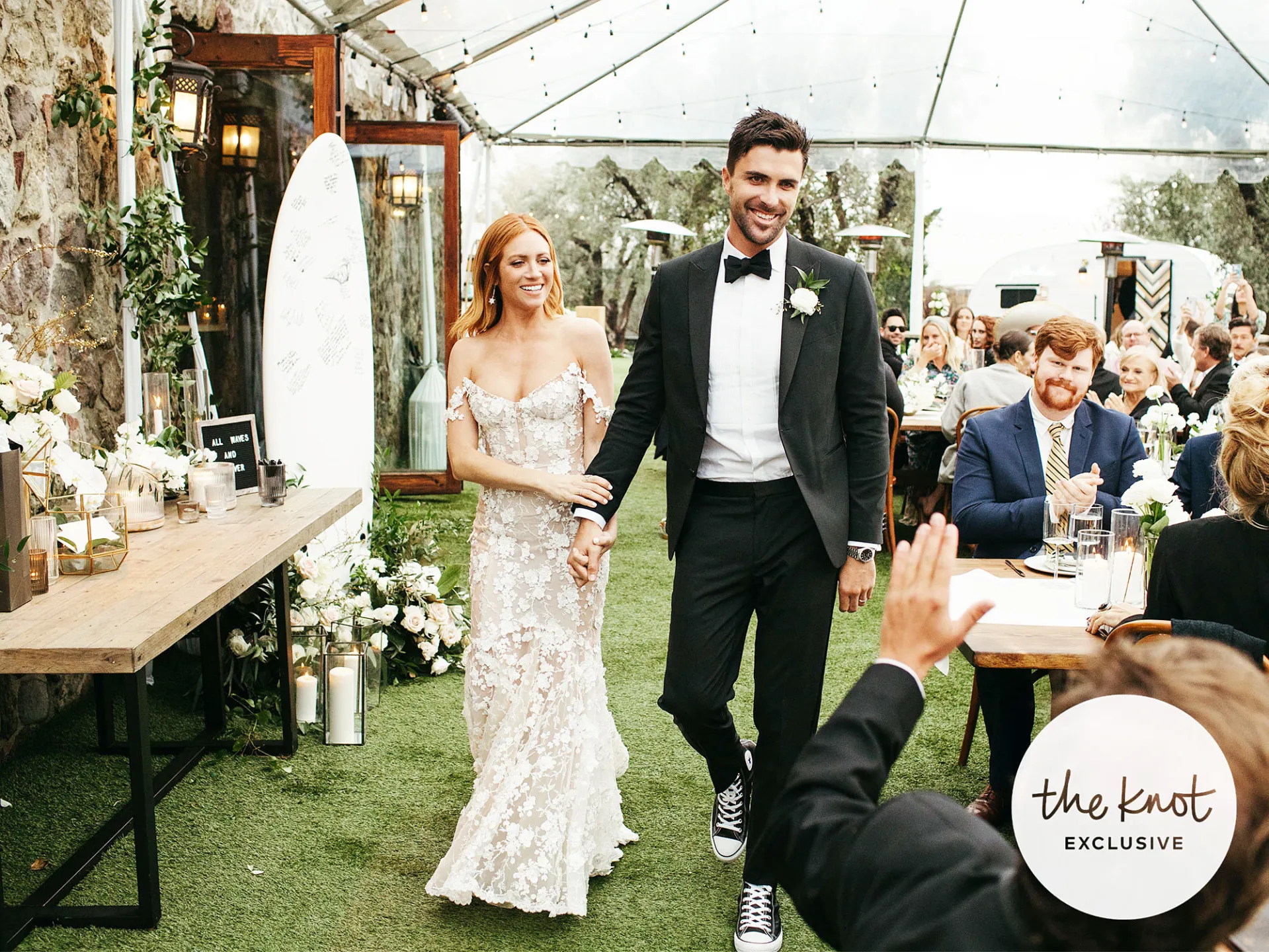 “I fell in love with the off-the-shoulder, floral sleeves,” she told the outlet. “It was the perfect combination of reception fun: classically-fitted and gorgeously detailed.”