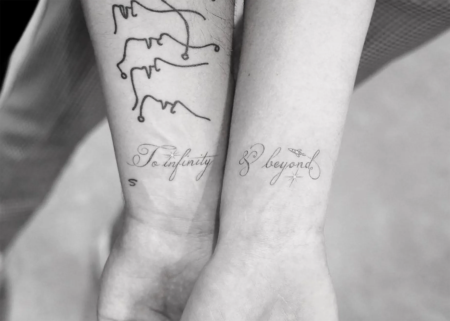 Take note: There are two types of matching tattoos. There are those that are literally identical, like Kylie Jenner and Travis Scott’s butterfly tattoo dedicated to their daughter Stormi. And then there are those, that together, tell a story. Take Joe Jonas and Sophie Turner’s Disney-inspired tattoo as an example of the latter. Jonas has “to infinity” tattooed on his wrist and Turner has “& beyond” inked onto hers.