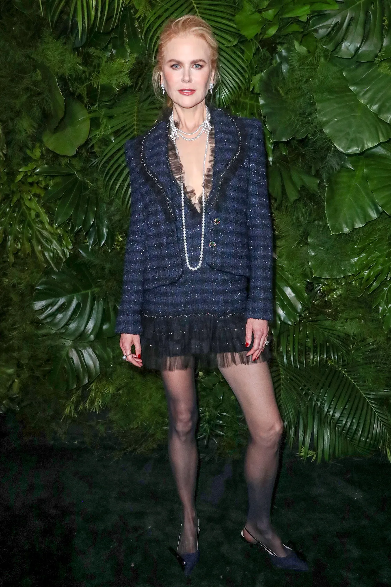 Black was a popular choice for the event. Stewart, 32, posed in a knitted tank top and shorts set. The Spencer star was seen hugging Kidman, 55, who wore a black ruffled mini dress under a classic navy blazer with layered pearl necklaces.