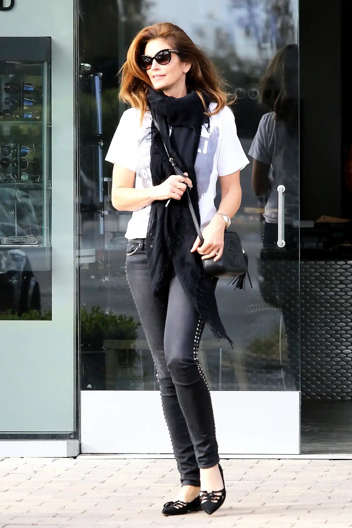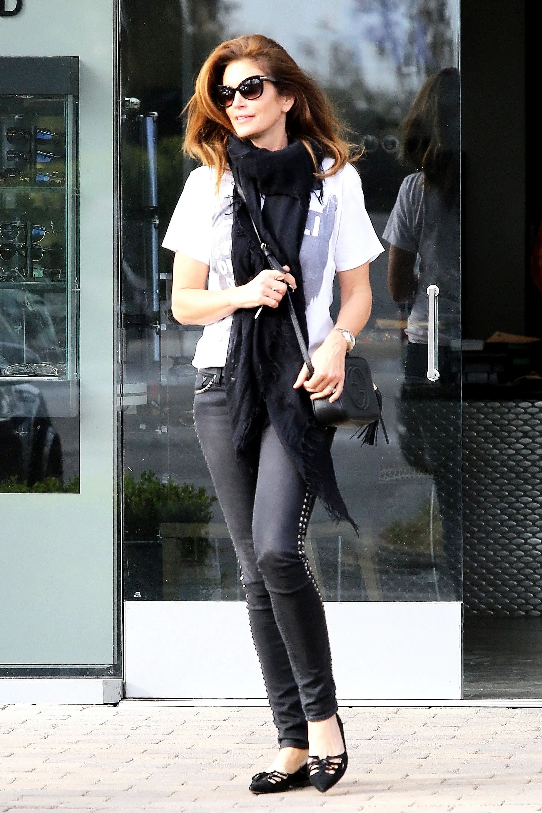 Jeans are a closet staple, but if you’re feeling over your denim these days, let Cindy Crawford give you some wardrobe mojo. The supermodel mom stepped out in LA looking effortlessly chic in a graphic tee, studded jeans and flats.