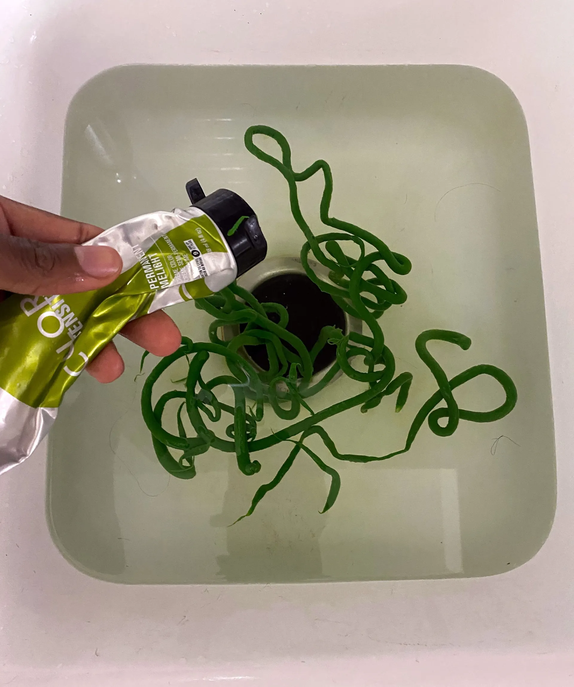 To bring her outworldly hair to life, the first step was to dye the “Say So” singer’s long platinum blonde wig using Joico hair products. He filled a sink with hot water and then squeezed two tubes of Joico Color Intensity Semi-Permanent Hair Color in the shade named “Limelight.” Then, like a witches brew, he used a large spoon to mix up the concoction until it turned green.