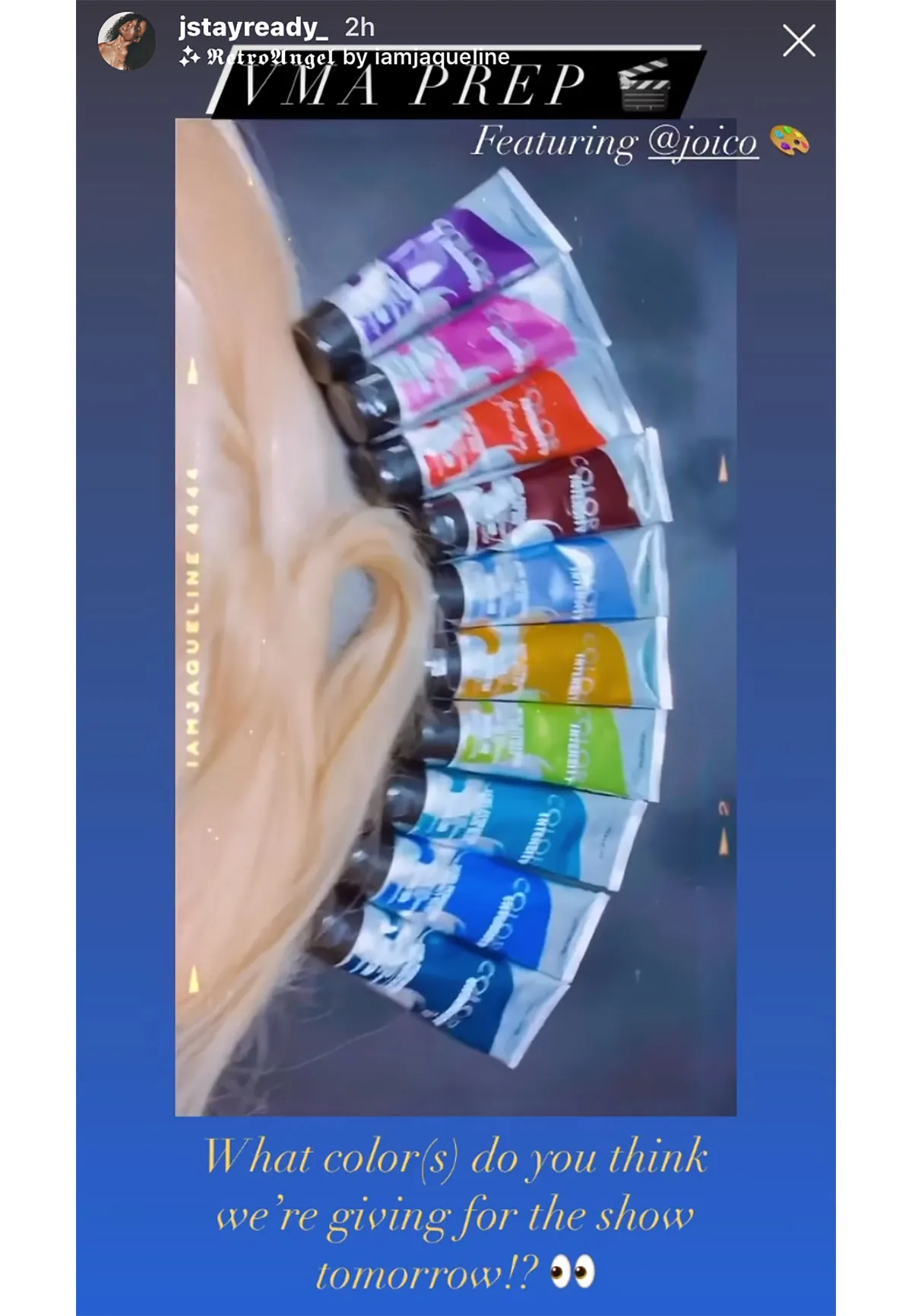 But that’s not all. A lot more work went into that hairstyle backstage before the star stepped onstage for her VMAs performance. Henderson said that he first “wet the hair down with spray bottle before applying Joico Power Whip Firm Hold Design Foam Mousse to mold the hair as I combed it back and away from the face.”