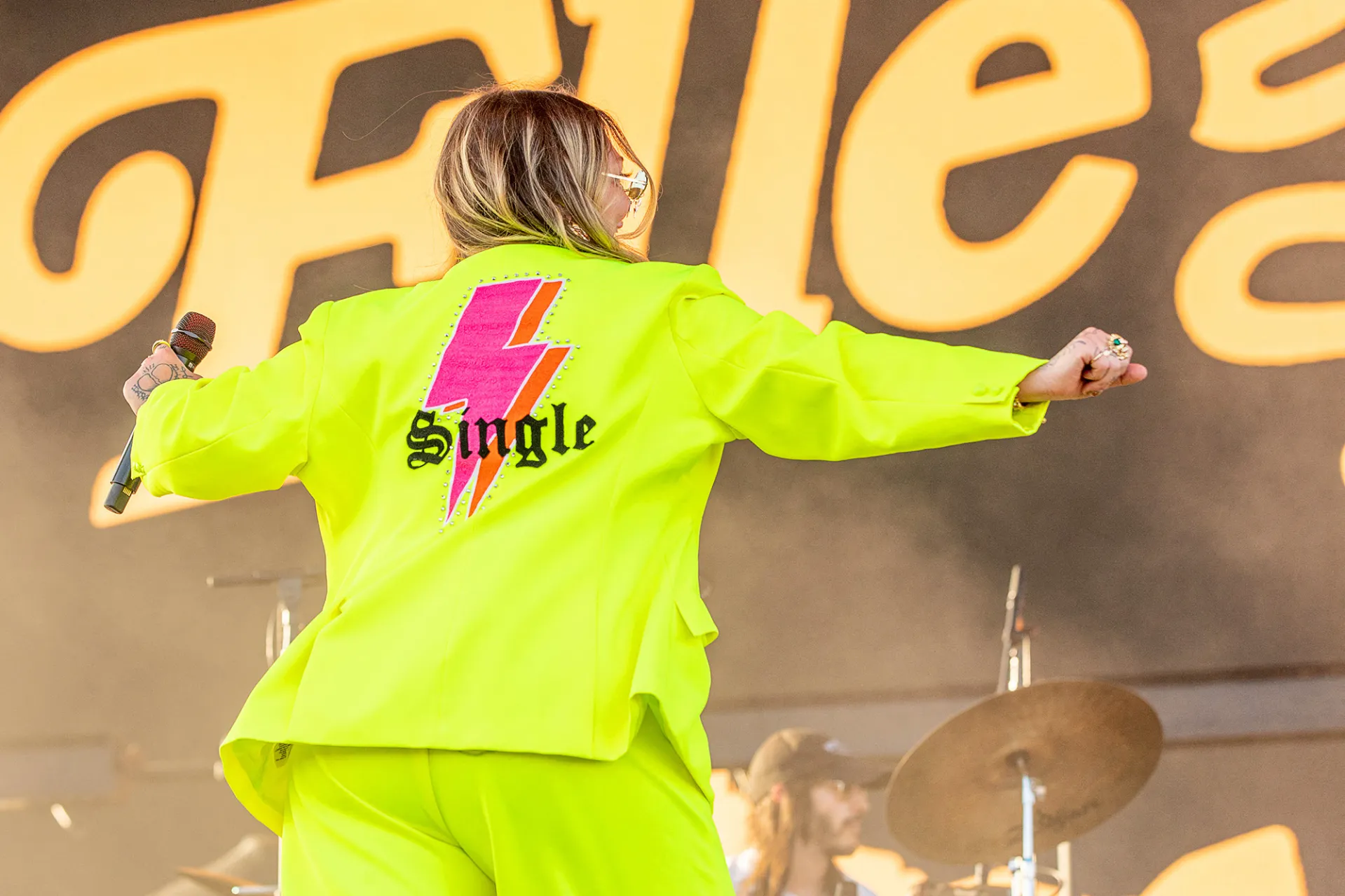 The country artist, 33, took to the Indio, California, festival stage on Friday, April 28, rocking an eye-catching neon yellow suit. The chest of the blazer featured two hot pink thunderbolts with red shadowing. The back of the top showcased one large thunderbolt in the same pink and red hues, with “Single” overlaid in black, designed in an Old English font. King paired the ensemble with a white corset top.
