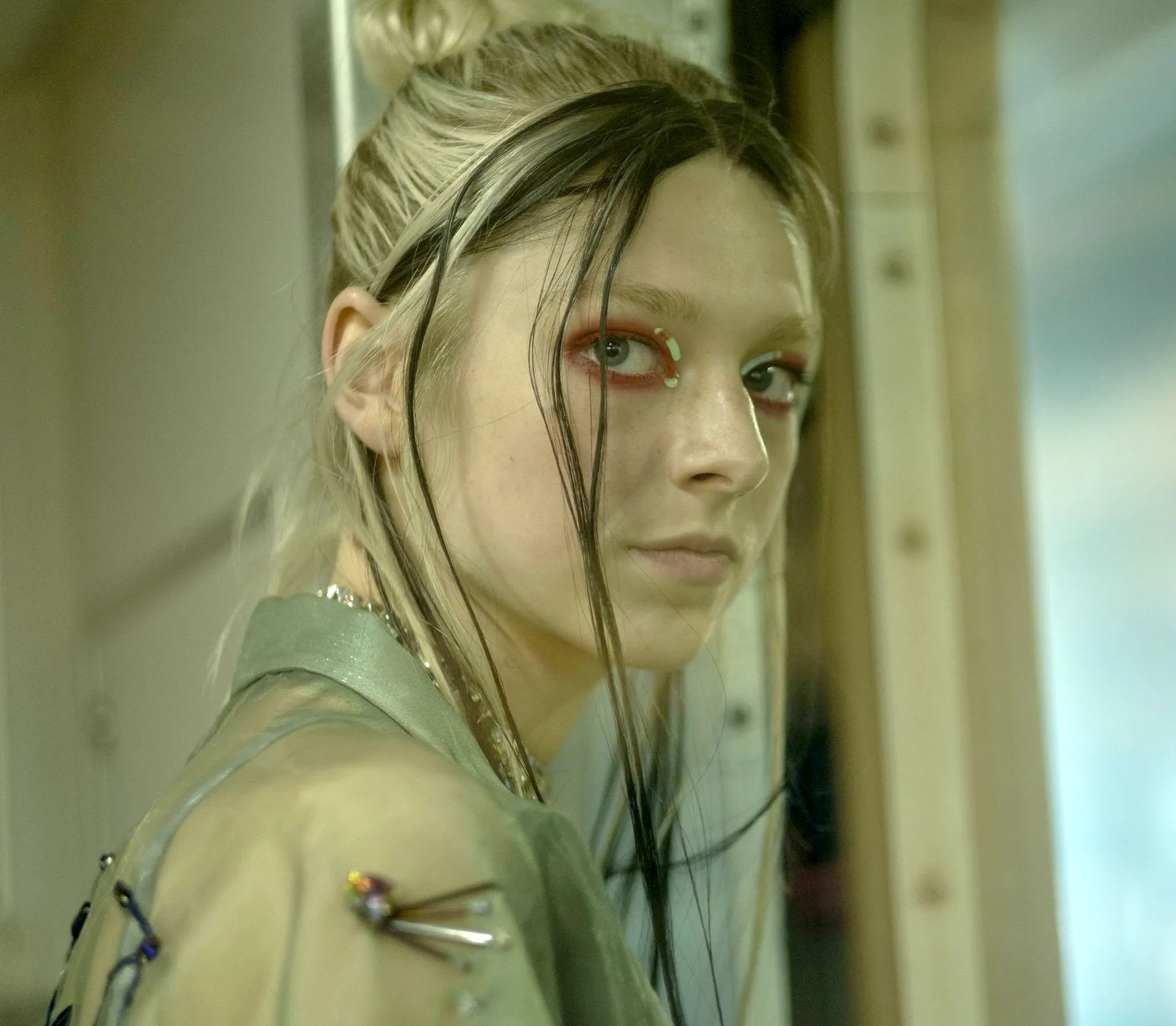 Alexa Demie’s Maddy, who always likes attention, wears rhinestones along her lash line when she’s in her “hooker” outfit. But when she has a difficult day, she hides behind sunglasses and a hoodie, wearing nothing more than a layer of foundation.