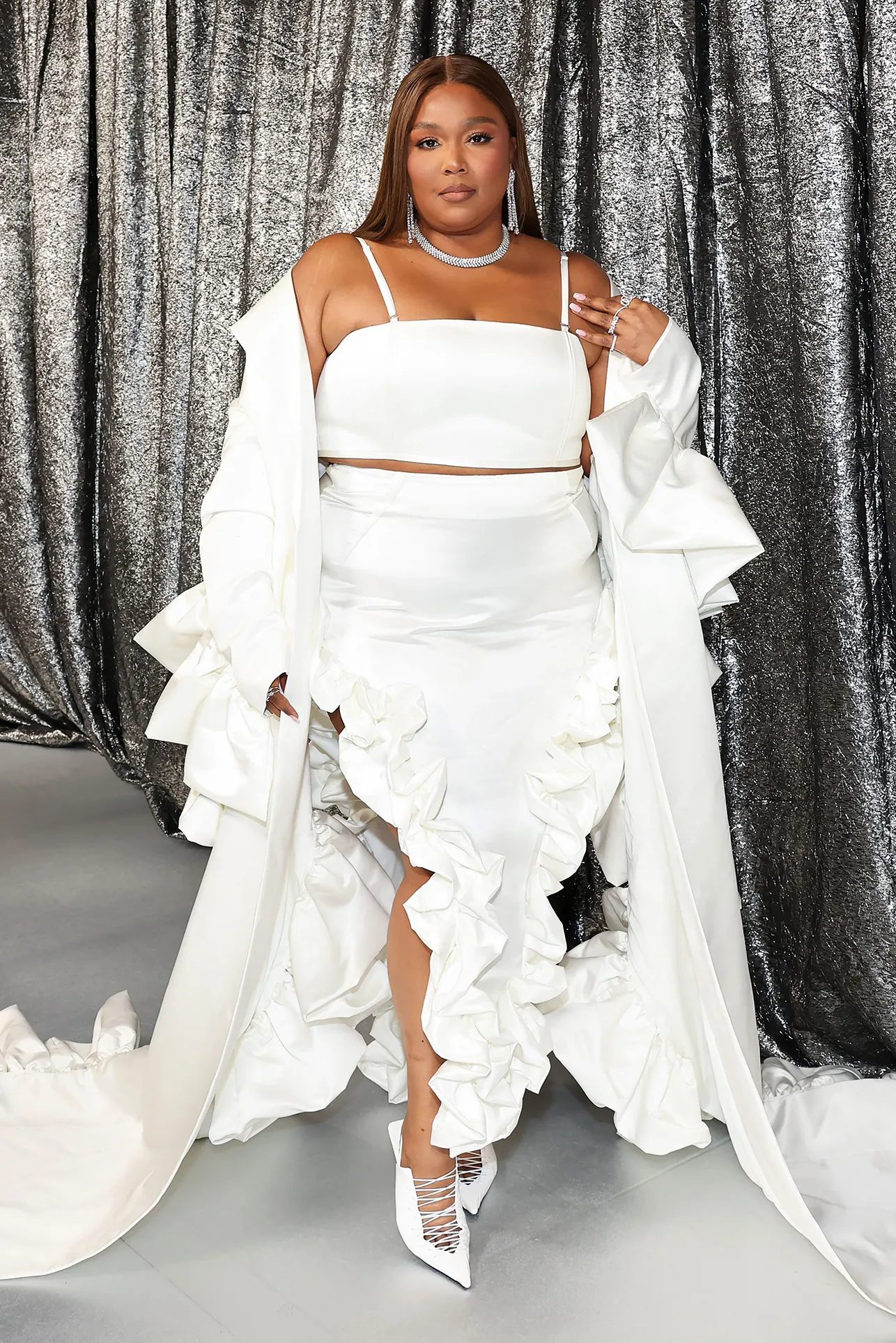 Of course, Beyoncé’s big night wasn’t complete without an appearance by Queen Bey herself. The record-breaking Grammy winner stunned in a custom, strapless silver Versace gown that complemented her newly lightened platinum blonde locks.