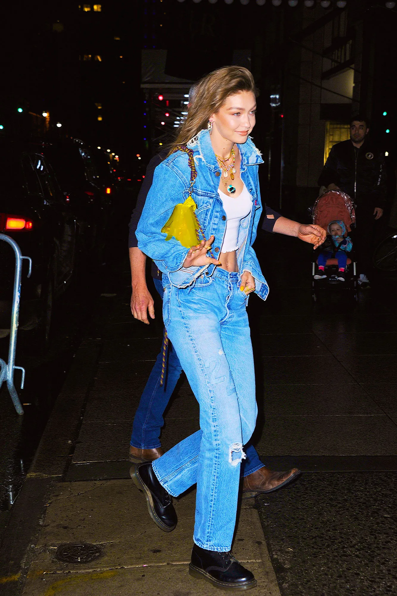 The model led by example wearing her classic light-wash style, opting for a Levi’s Trucker jacket, Levi’s 501 Jeans and a white crop top. She accessorized her chill ensemble with a neon yellow bag, multiple rings and a series of statement necklaces including one featuring a Taurus symbol from Mercii and Éliou’s Paxi shell chain.