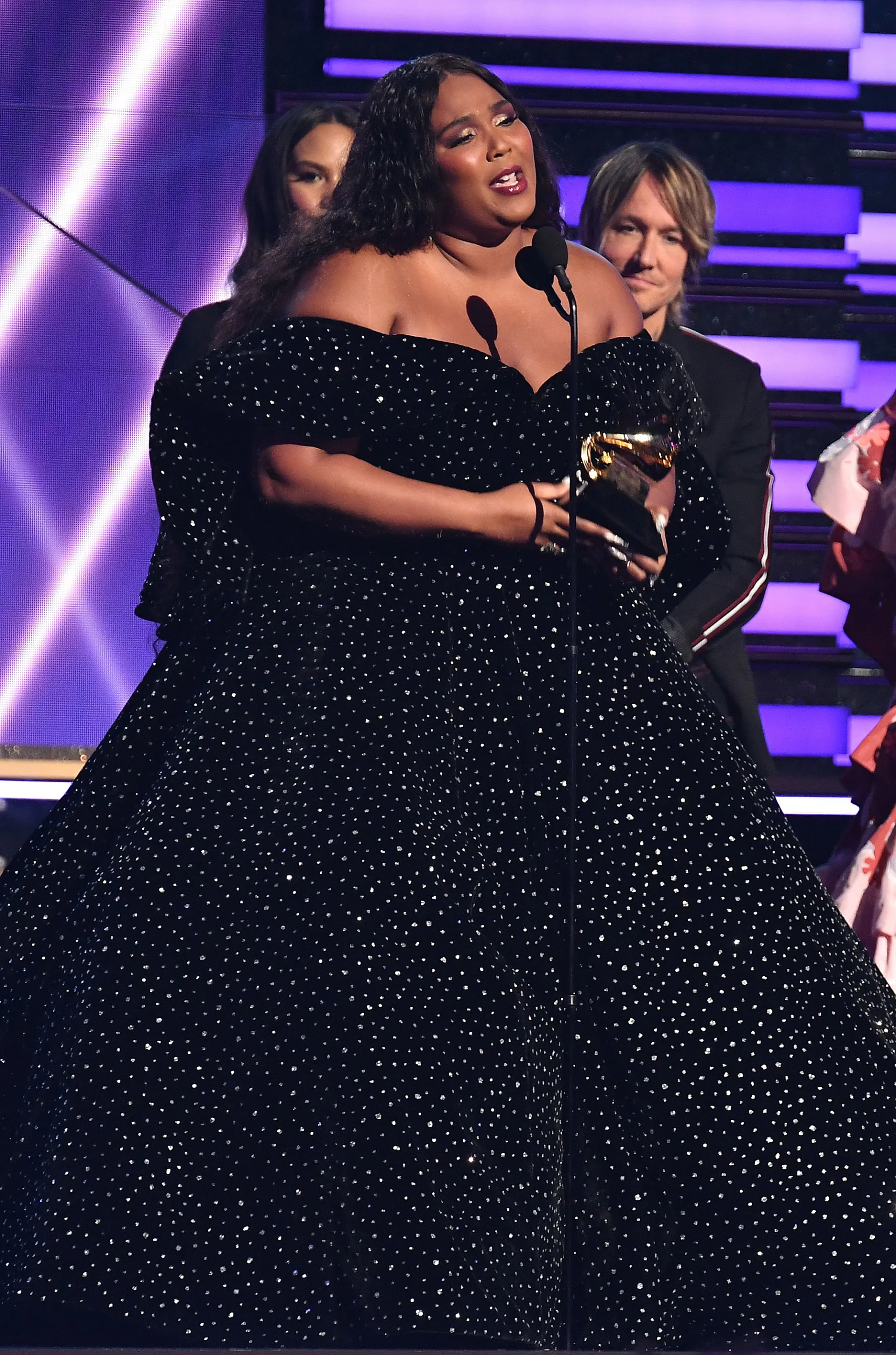 She kicked off the ceremony with a show-stopping medley of “Because I Love You” and “Truth Hurts,” for which she wore two ensembles. The first was a custom Christian Siriano ball gown, a standout in its own right, with sparkly crystal adornments and an extra-large skirt. Then for the second half of the performance, Lizzo quickly changed into a neon bodysuit paired with sequin-covered combat boots.