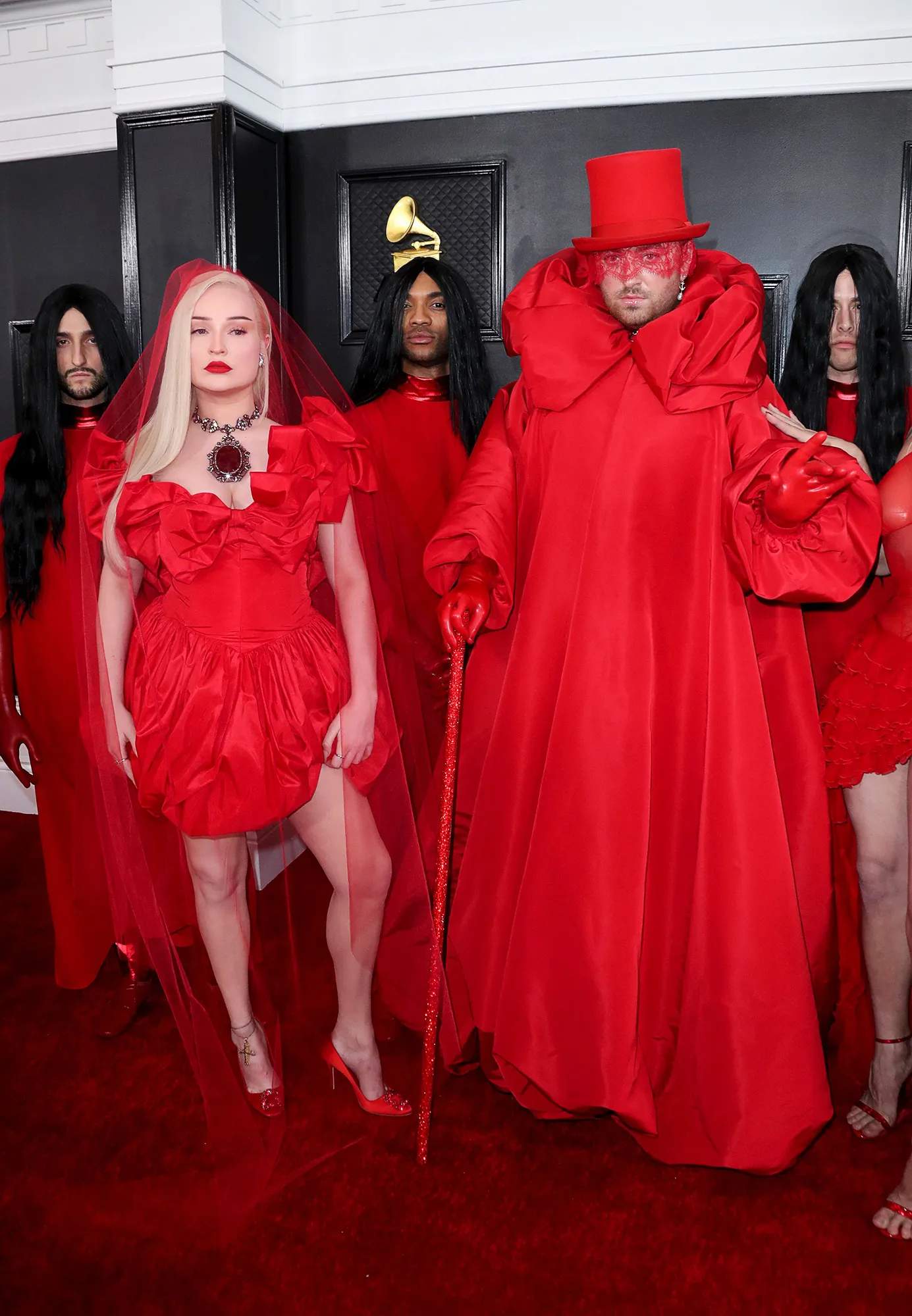On the carpet, the “Fire on Fire” artist posed with their “Unholy” collaborator, Kim Petras. The duo took home Best Group Performance for the track at the Sunday soirée. The Germany native, 30, matched Smith in a red mini dress that was designed with a bubble skirt. She accessorized with a cascading veil, a massive pendant necklace and rosy pointed-toe pumps.