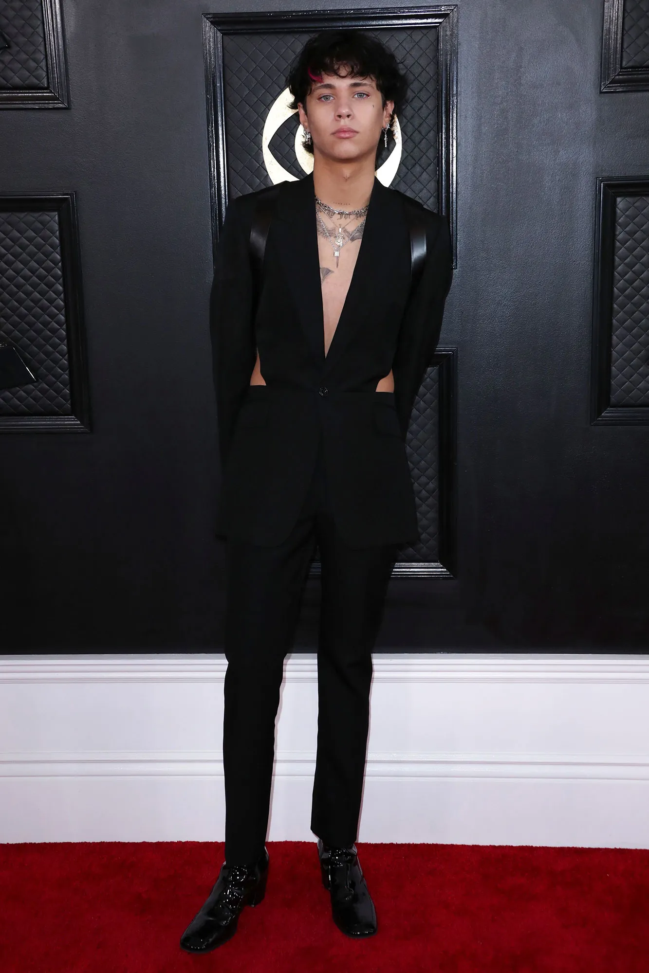 Another fine fella was Machine Gun Kelly. He commanded attention on the red carpet in a custom Dolce & Gabbana getup. The garb included a silver suit and was finished with floral details. To add even more bling to the ensemble, the “Bloody Valentine” singer donned a diamond harness layered over the jacket and silver nose rings.