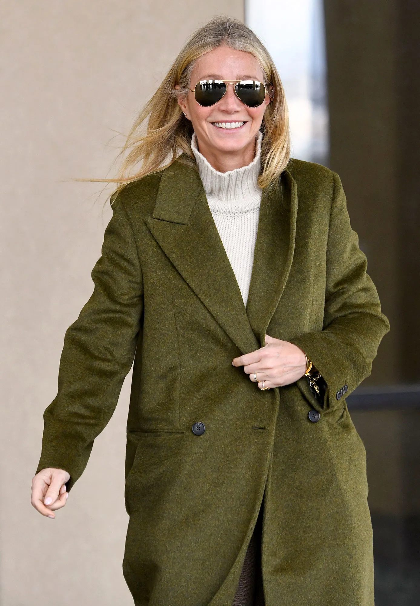 The Goop founder looked crisp on Wednesday, March 22, wearing an off-white belted cardigan from her brand, G. Label by Goop, and khaki pants. She accessorized with chunky gold jewelry from Foundrae and carried her belongings in a chestnut-colored tote. She layered the look with a green wool coat.