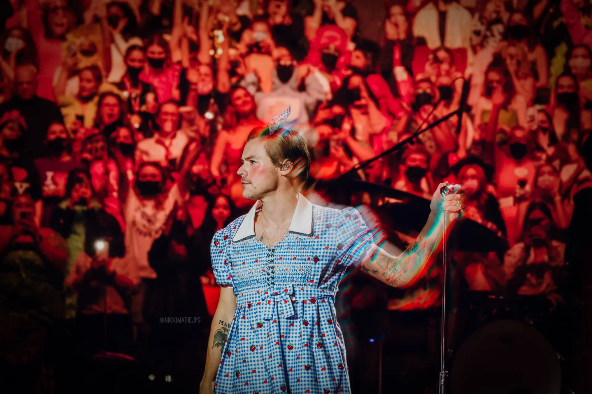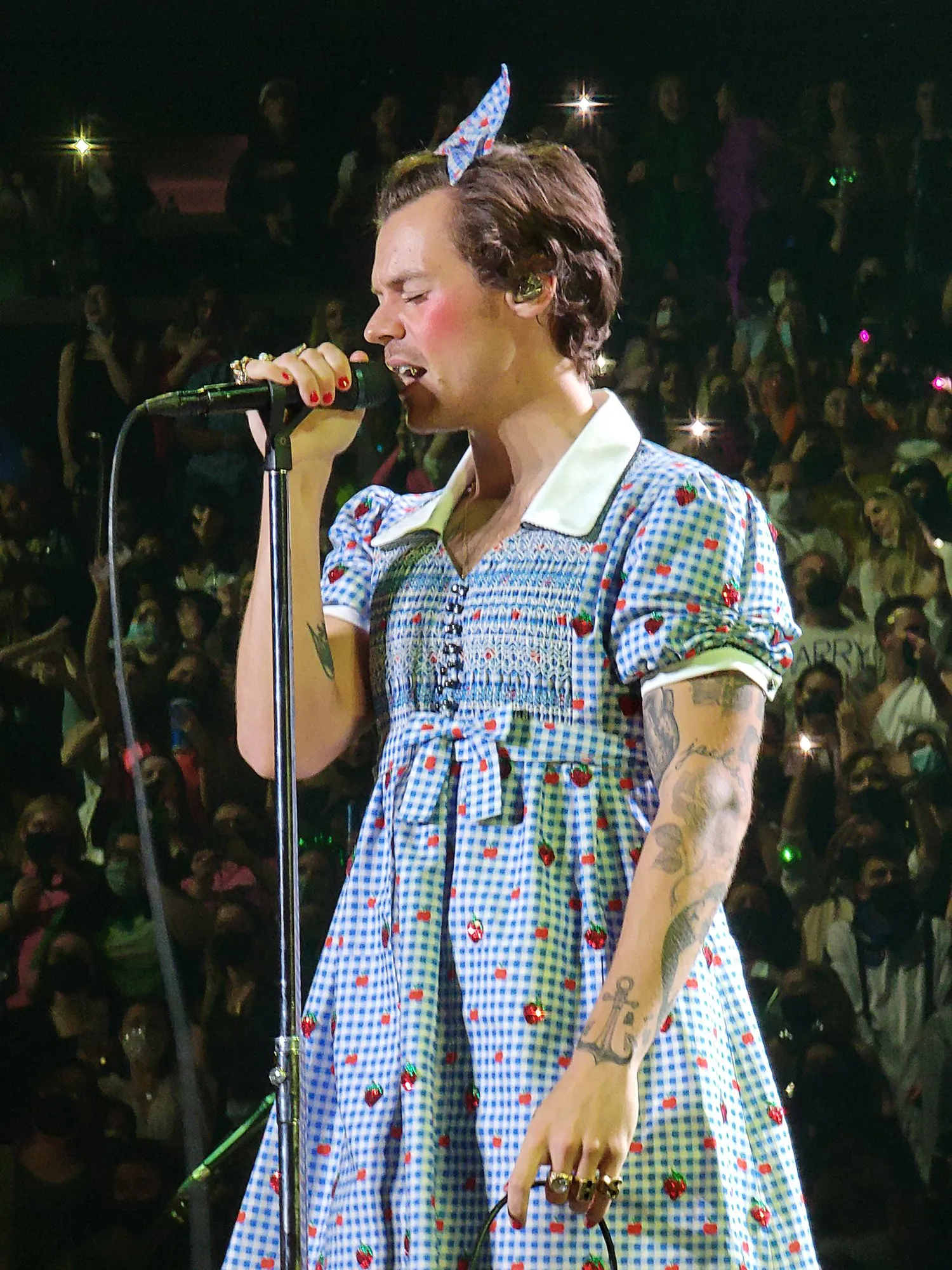 Throughout the Saturday night show, much of Styles’ set list replicated his earlier concert stops with one new number: A sweeping cover of “Somewhere Over the Rainbow” to accompany the squad’s costumes.