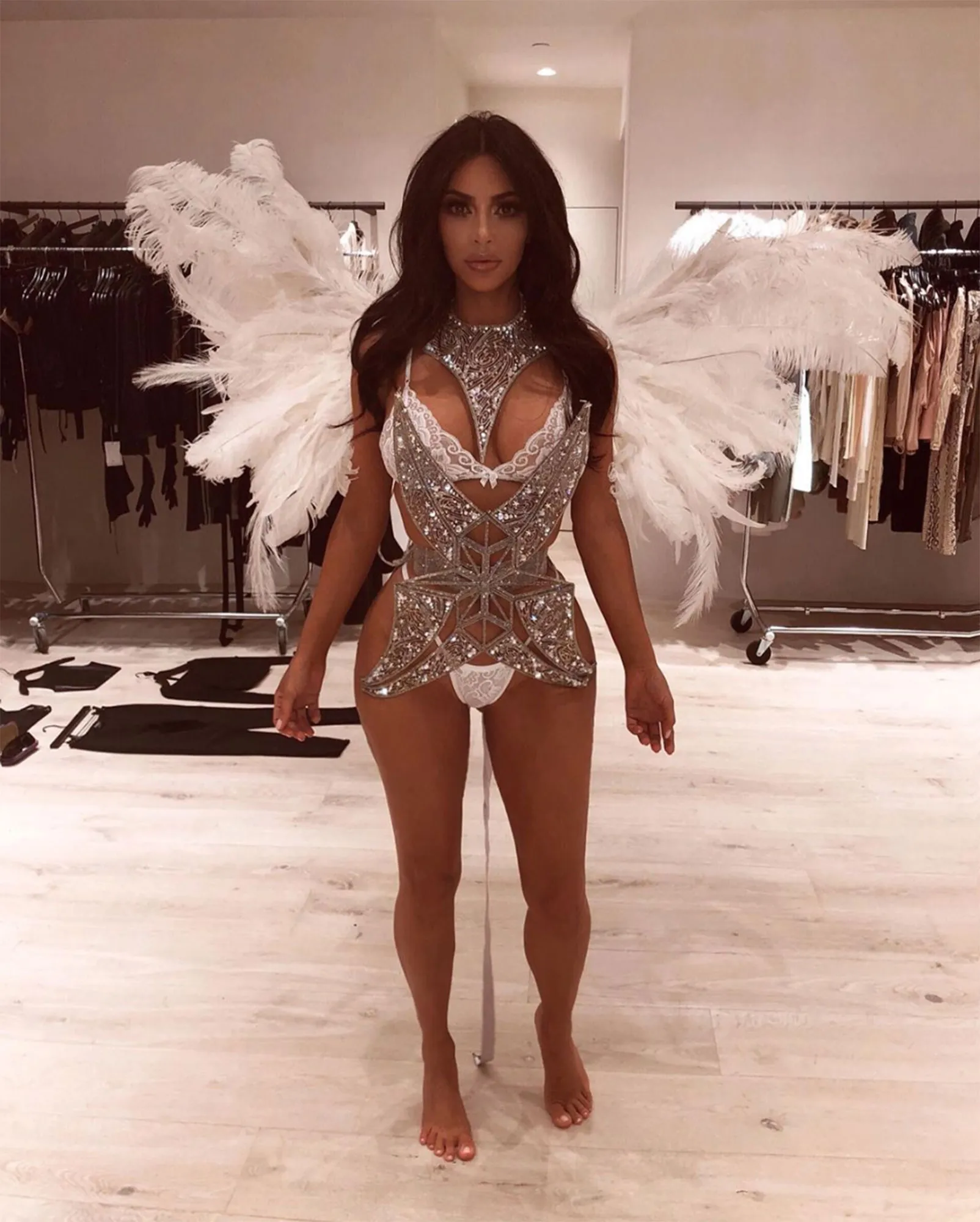 Another one of Luxury Handbag Shopping Stylish’s favorites: On January 15, 2019, she posted a throwback fitting picture from when she was trying out her 2018 Victoria’s Secret Angels Halloween costume. Even though this look didn’t make the cut, we almost like it more than her final costume. The wings, along with the silver encrusted bodice, make it almost too much of a standout look. After all, she had to blend in with her sisters.