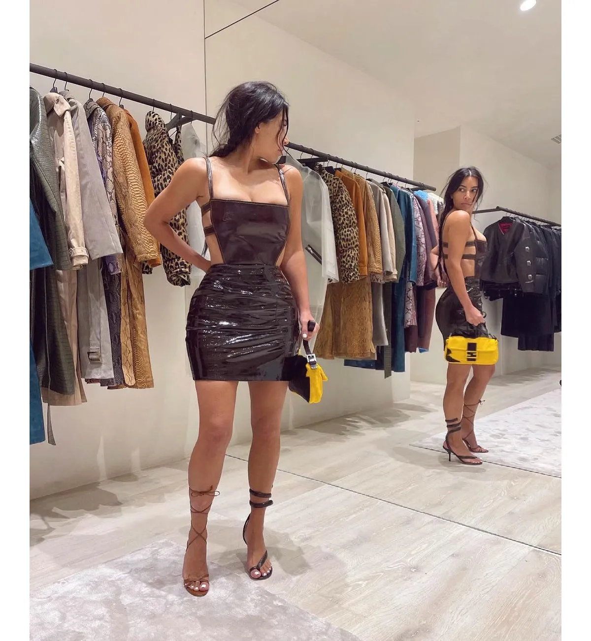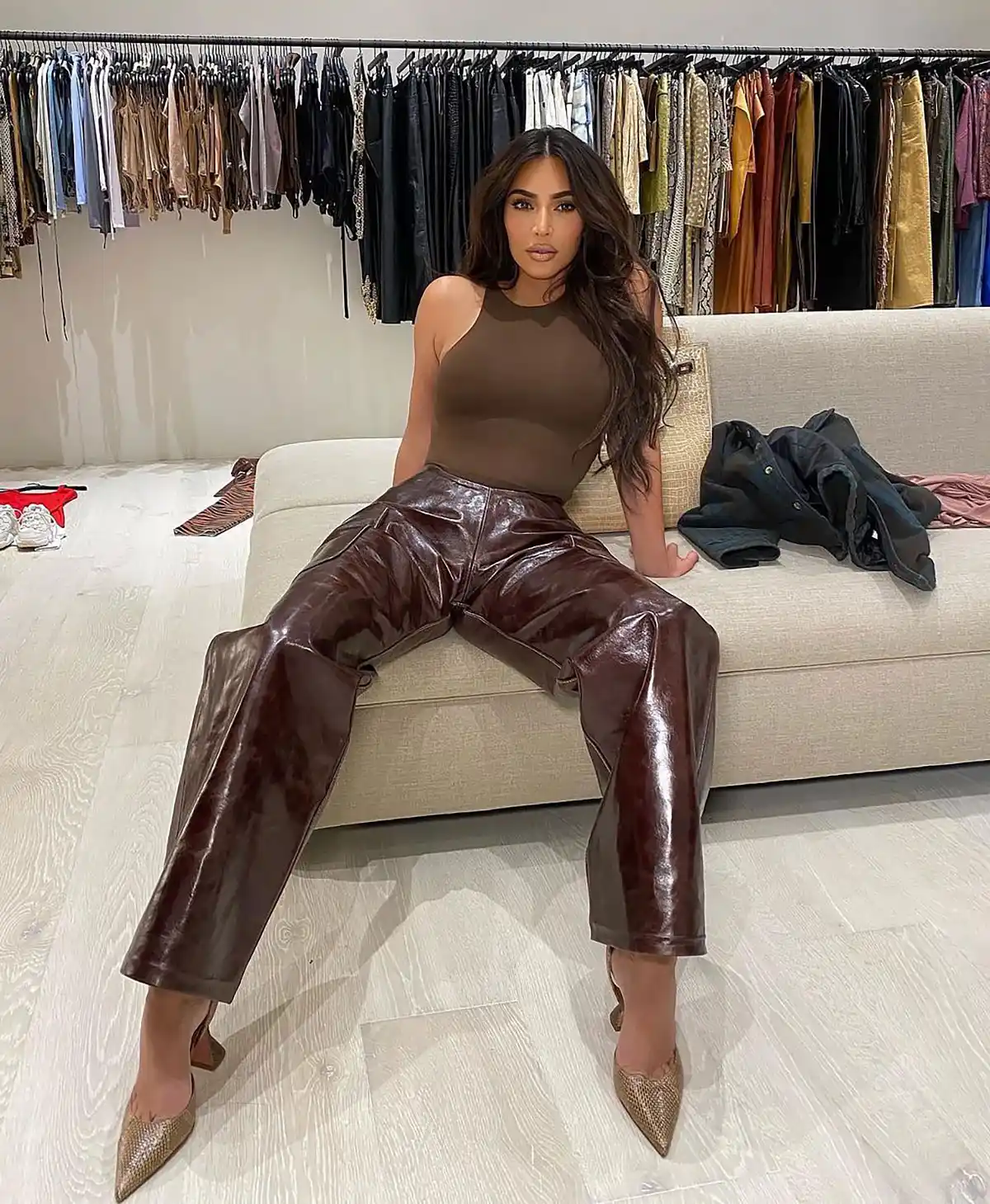 These days, the mom of four continues to bless her 259 million Instagram followers with her fittings pics, often posing for mirror selfies in her drool-worthy walk-in closet. Occasionally, she even gets her following involved. In May, she posted a photo to her feed wearing a Miu Miu mini dress with a Manolo Blahnik heel on one foot and Bottega Veneta on the other. She captioned it, “Which shoe???”