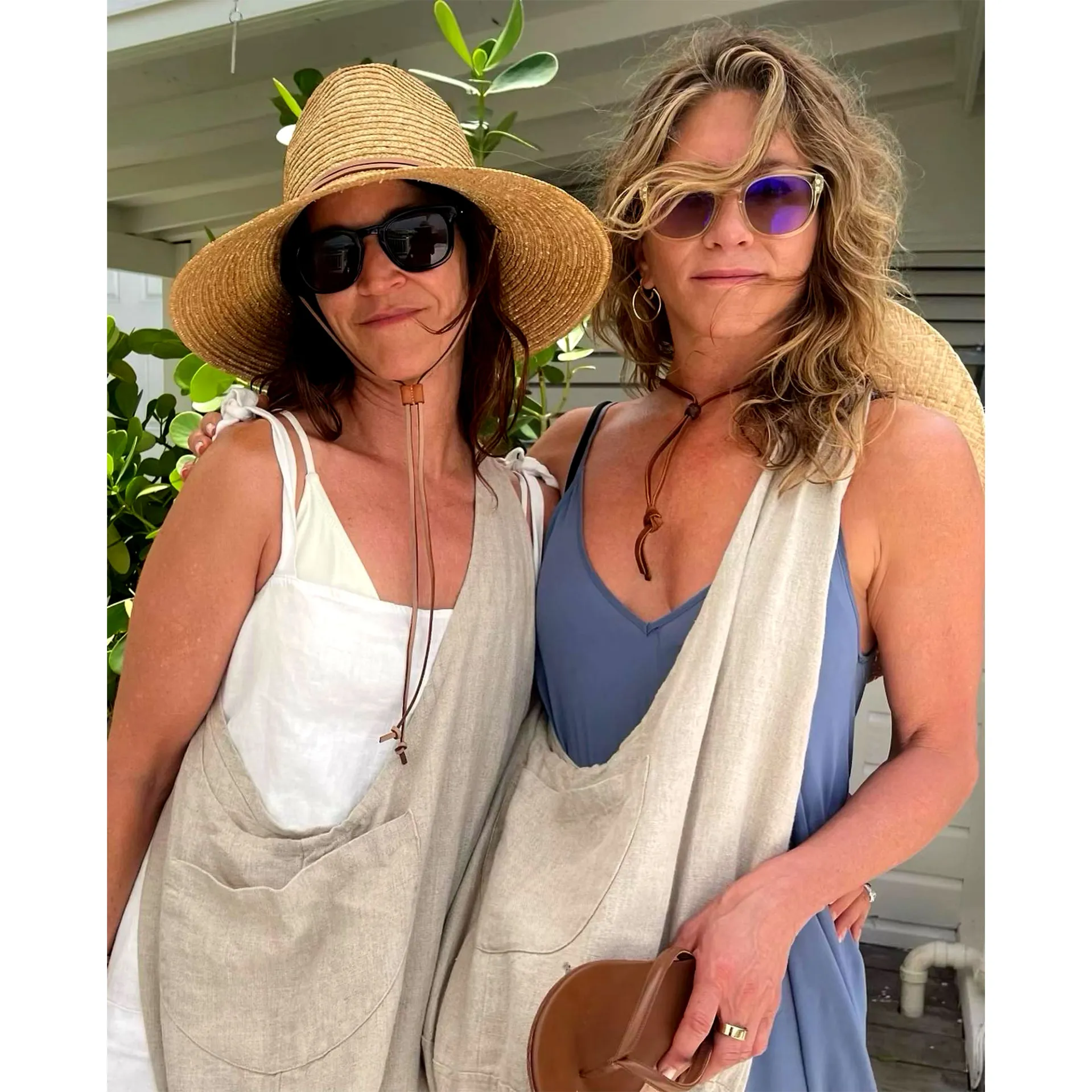 In a second picture, the Emmy winner threw on a blue dress, sunglasses and sandals as she posed alongside Bateman’s wife, Anka. The women carried matching satchels and Aniston opted to keep her hair natural, sporting beachy waves.