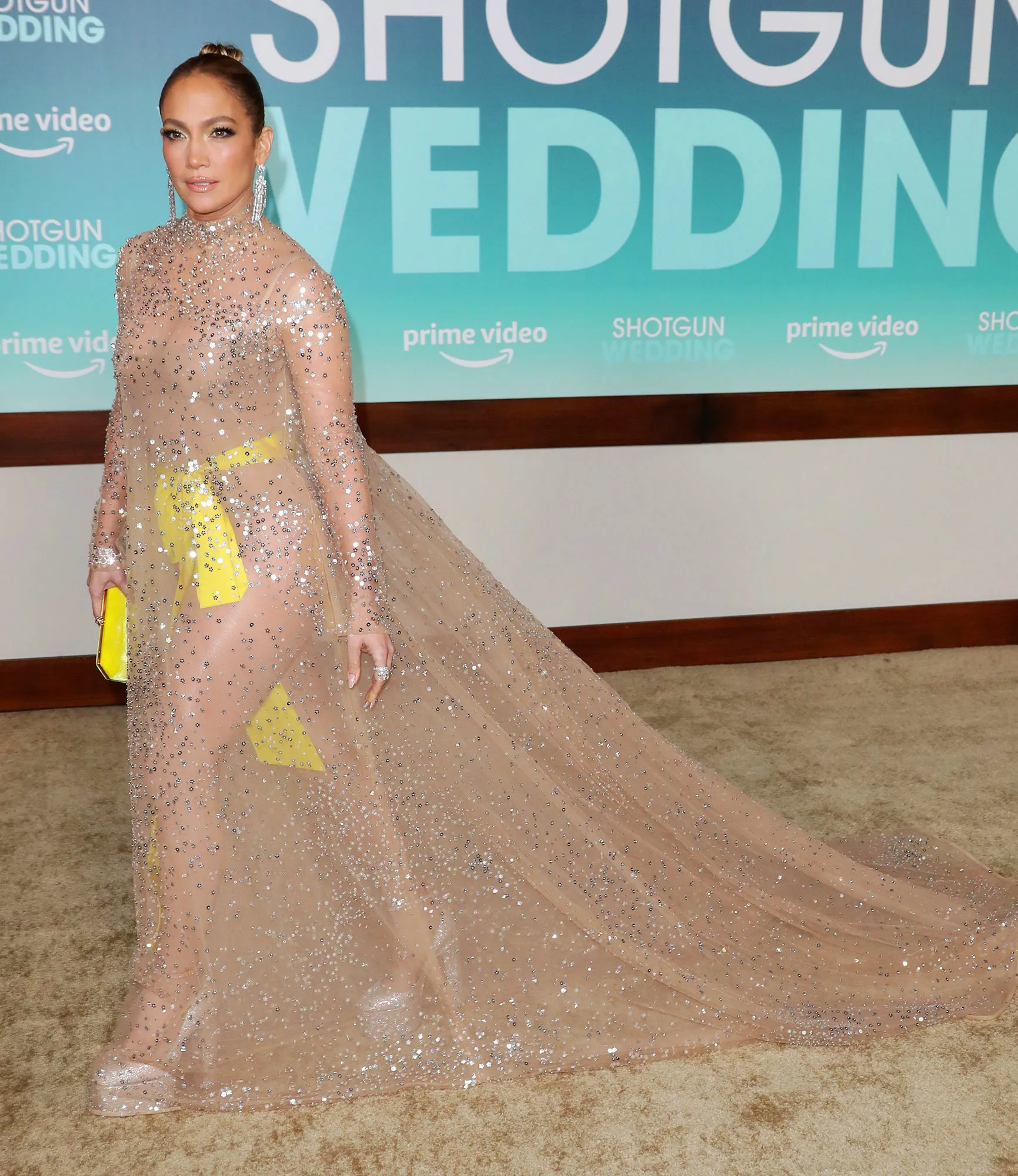 For the red carpet soirée in Los Angeles, Lopez, 53, stepped out in a sparkly creation by Valentino. The gown — which first debuted on the runway of the label’s fall 2022 couture show — featured completely sheer, sequin-covered fabric that was equipped with sleeves and a loose-fitting skirt. Underneath, the “Get Right” artist donned a beige bodysuit that was teamed with a yellow bow at the waist.