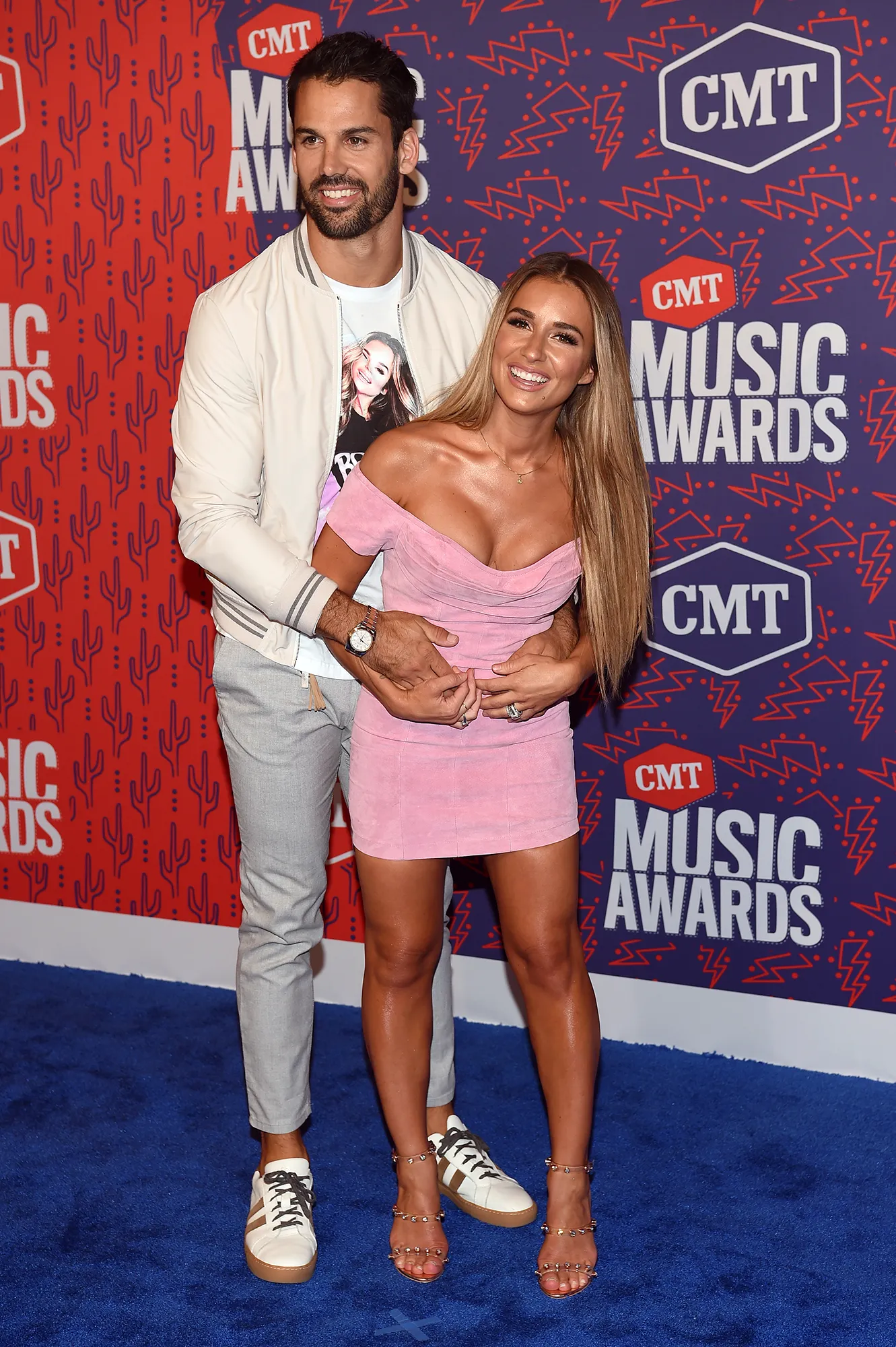 Figure-hugging frocks are a go-to for Jessie. At the 2019 CMT Awards, Jessie looked pretty in a pink suede mini dress. To complement her eye-catching outfit, Eric wore a T-shirt with his wife’s face on it, paired with a beige jacket, gray pants and sneakers. The athlete tends to lean on the casual aesthetic, often sporting basics under blazers — which allows Jessie’s sultry outfits to standout.