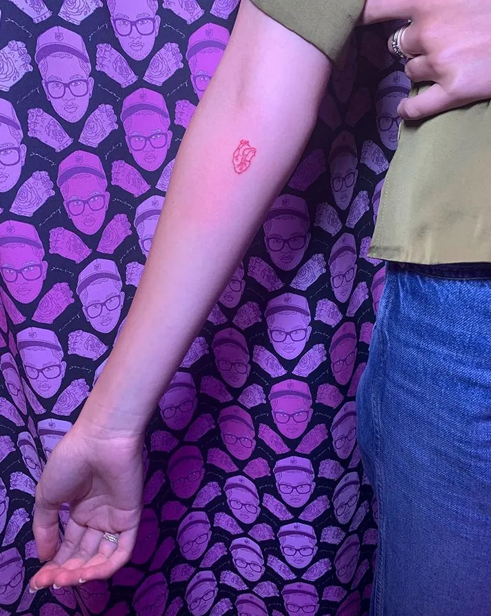 Two of the newer ones featured in the sexy snap were an angel on her rib cage and another dainty tat just below her right shoulder. Created by NYC-based tattoo artist Evan Kim, the shoulder design appears to be two interlocking arms in the shape of a heart.