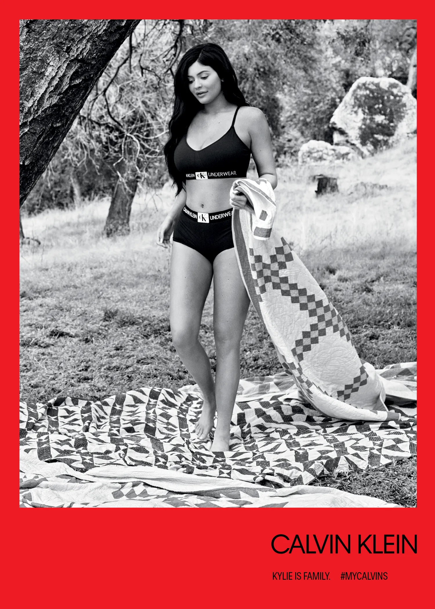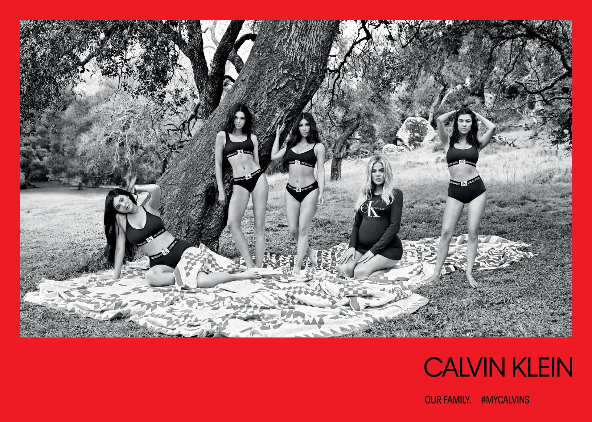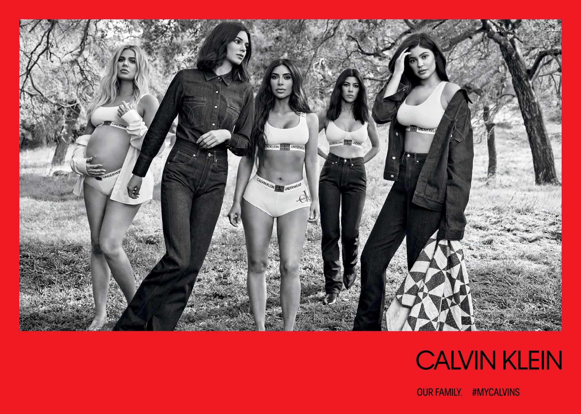 They’re back! After shocking Us with their Spring 2018 “Our Family. #MyCalvins” Calvin Klein Underwear campaign, the Kardashian-Jenner sisters are back in their skivvies once again modeling the brand’s Fall 2018 collection. Last time around, Kylie Jenner was concealing her baby bump behind Americana quilts, while Kendall, Kourtney, Kim and Khloé showed off their fit physiques in tighty whiteys. But this time, all five ladies (including a very pregnant Khloé!) are stripped down and sporting the latest offerings from Calvin Klein Underwear and Jeans amidst a luscious green backdrop.