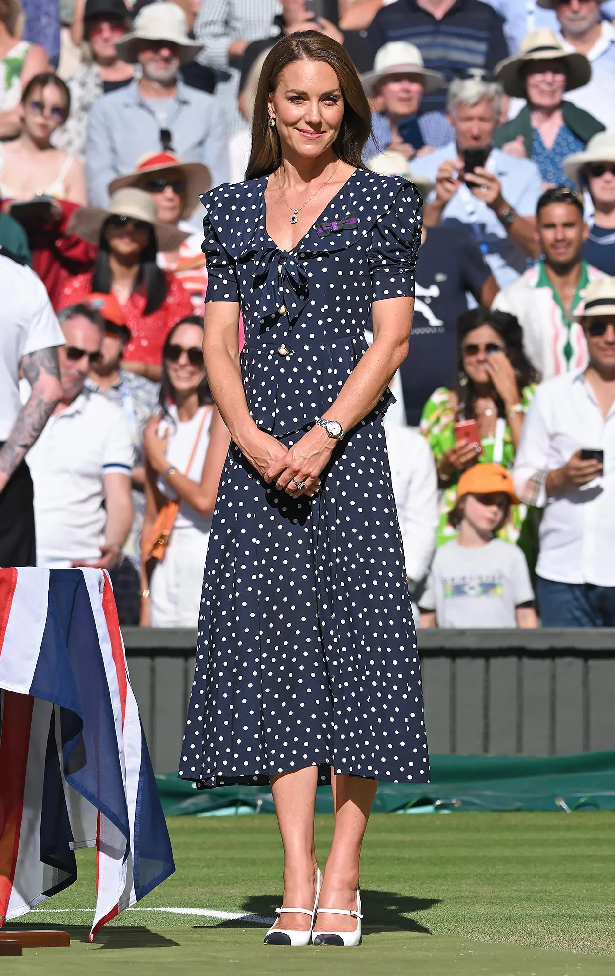 Although the majority of the outfits that Kate wears at Wimbledon are monochromatic, she also occasionally experiments with patterns, like when she wore the blue and white polka dot dress by Alessandra Rich in 2022.