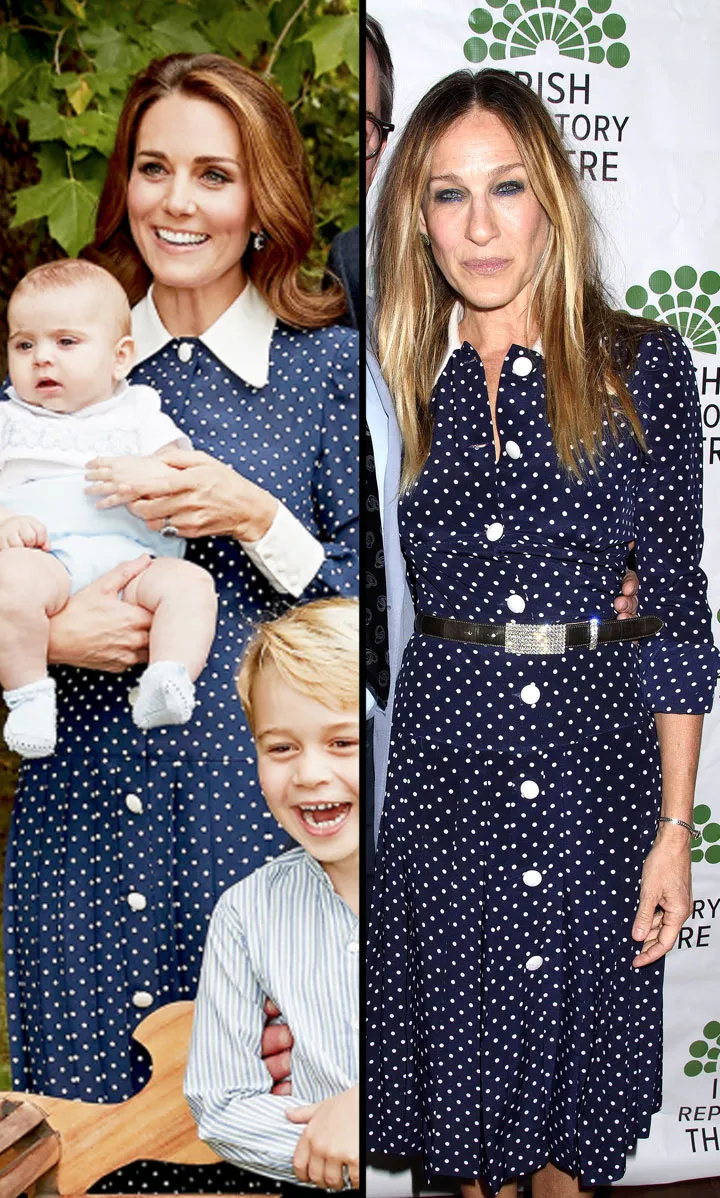 Spotted! Celebrities like Kate Middleton, Sarah Jessica Parker, Ivanka Trump and more have been sporting the same navy Alessandra Rich dress. It’s no surprise the pleated polka dot silk midi dress ($1,413, Net-a-porter.com) is currently sold out which a line up of celebs modeling it as fabulously as they have.