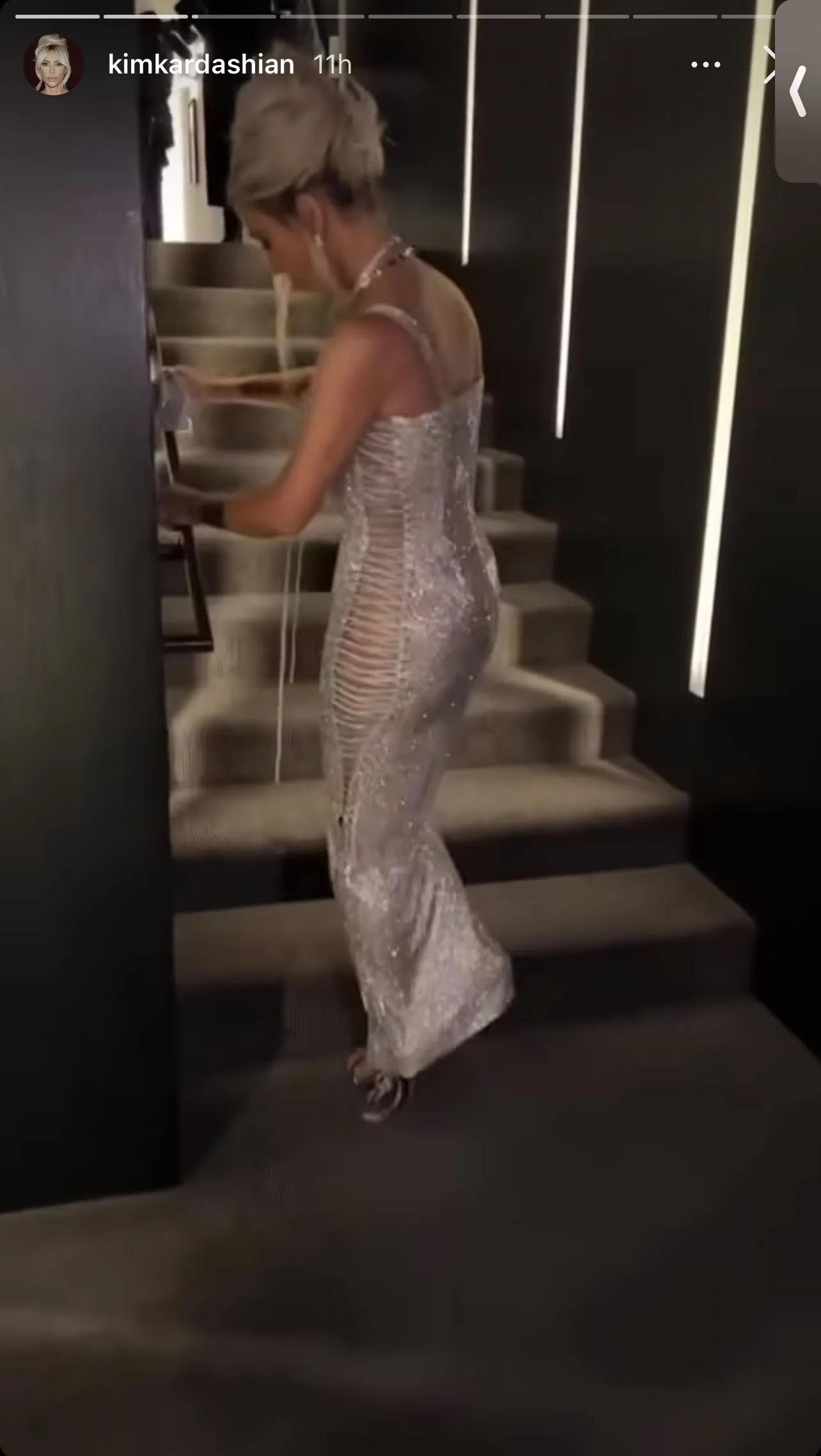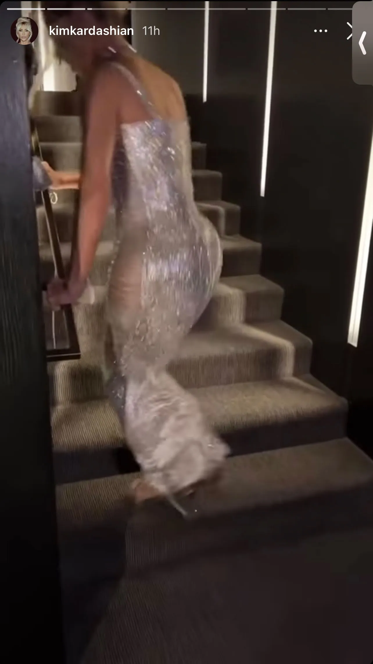 The reality star, 41, shared a series of videos via her Instagram Story on Monday, September 26, that showed her struggling to walk up a flight of stairs in the metallic corset number that she wore to celebrate her collection with the Italian fashion house during Milan Fashion Week. At one point, the Skims founder had to turn sideways and jump in order to maneuver in the figure-hugging frock.