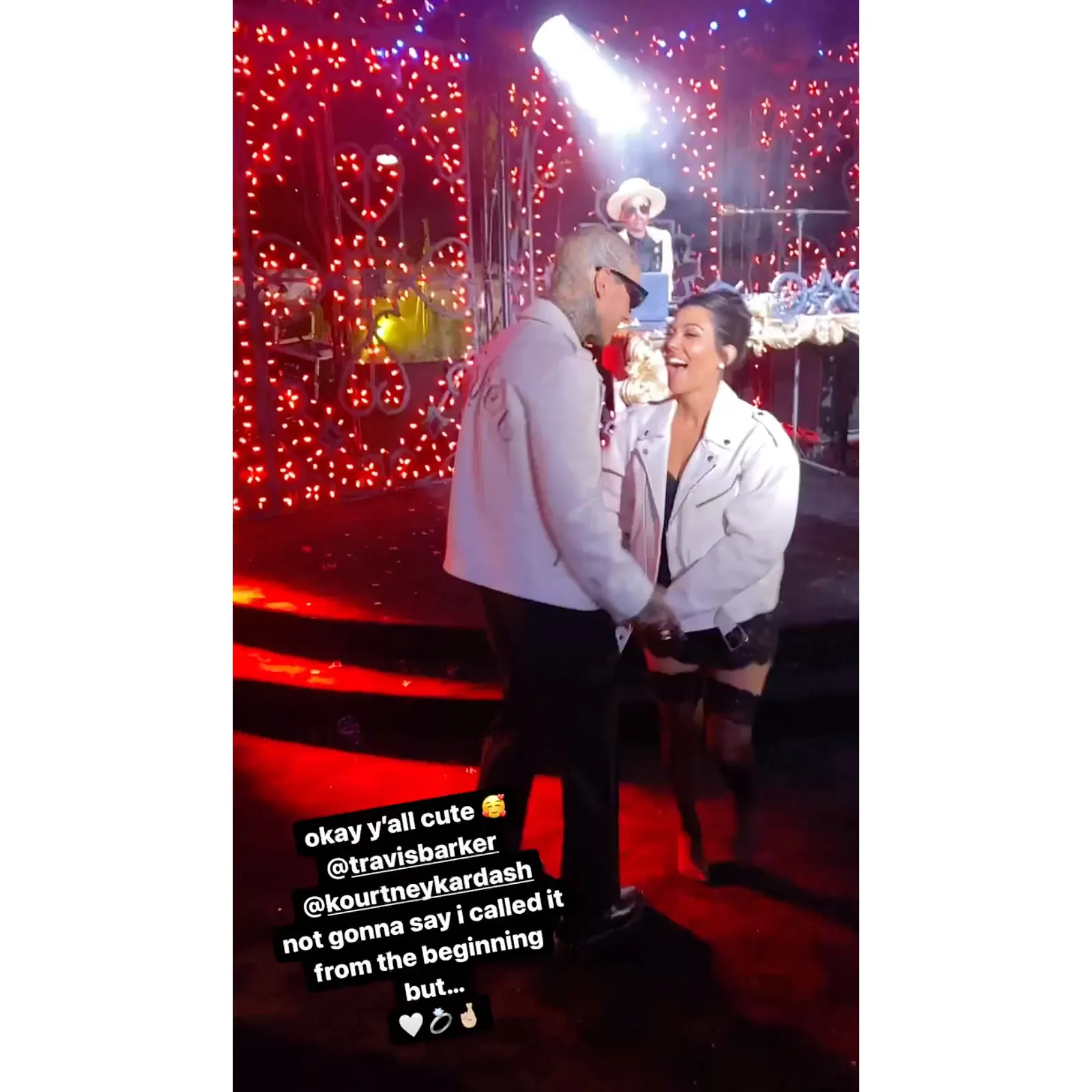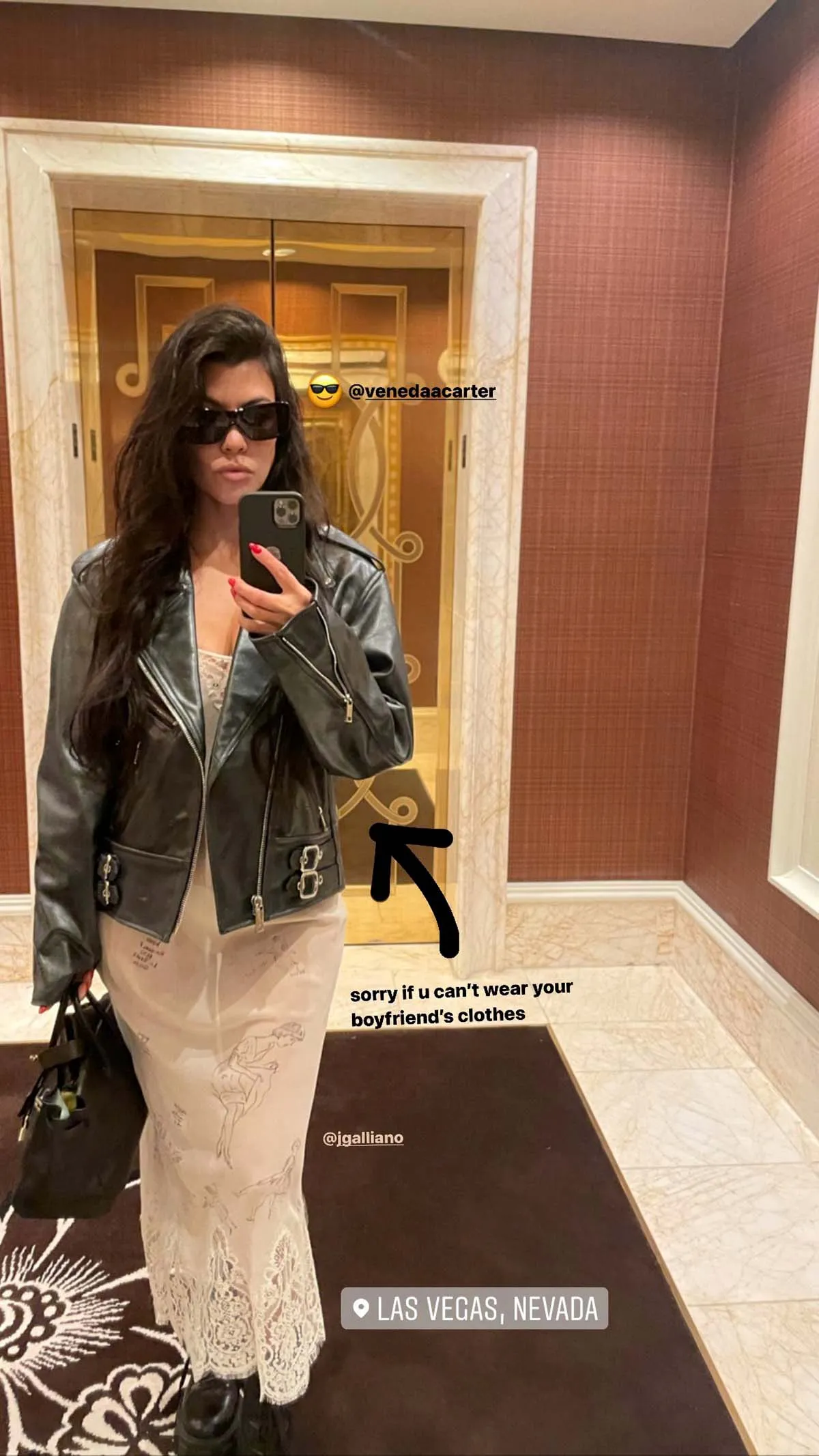 “Sorry if you can’t wear your boyfriend’s clothes,” she captioned her Instagram Stories, pairing Barker’s moto jacket from the night before with a lacy John Galliano dress and combat boots.