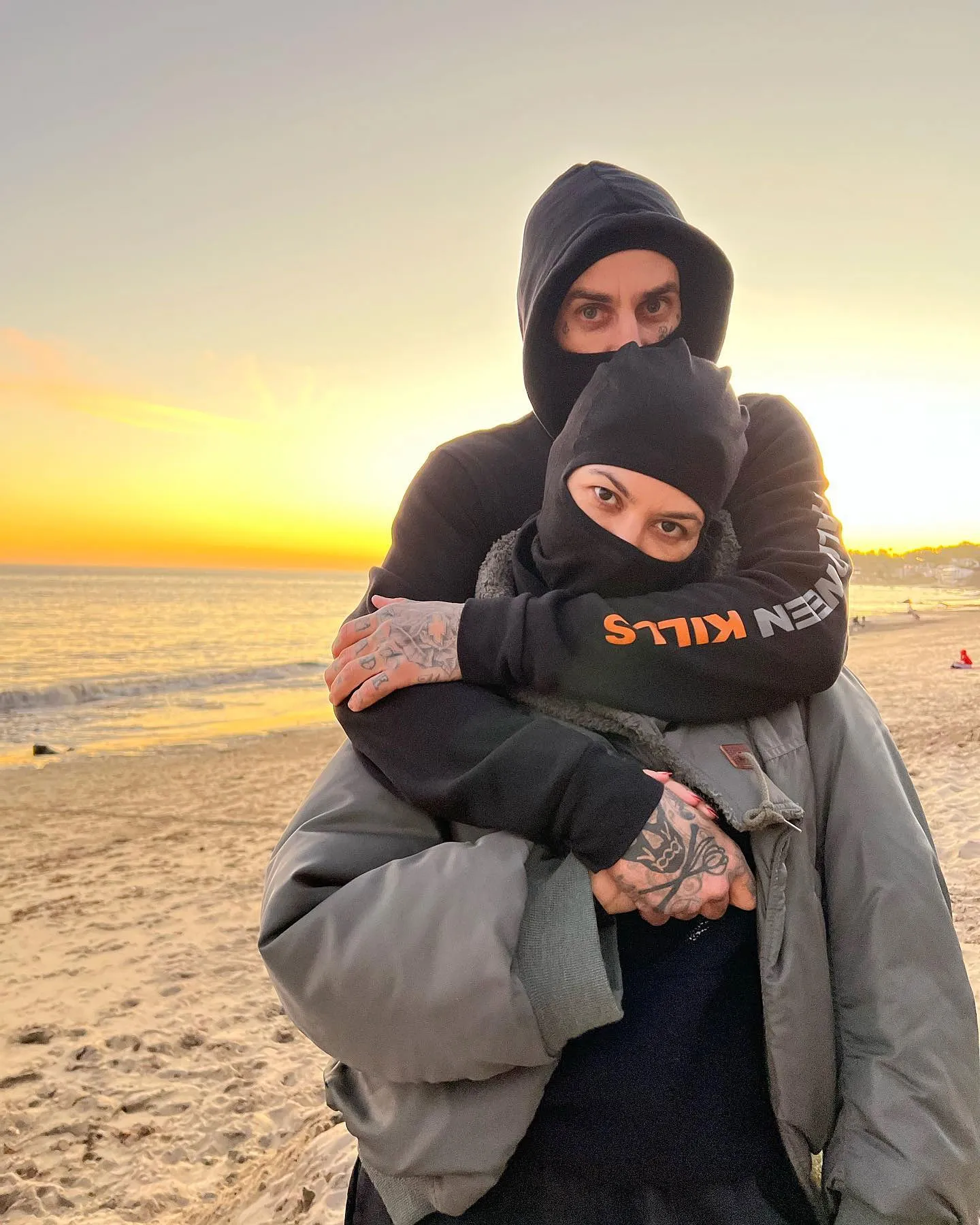 It appears that the couple isn’t above sharing clothing either, as Kardashian stepped out the following day wearing the drummer’s jacket.