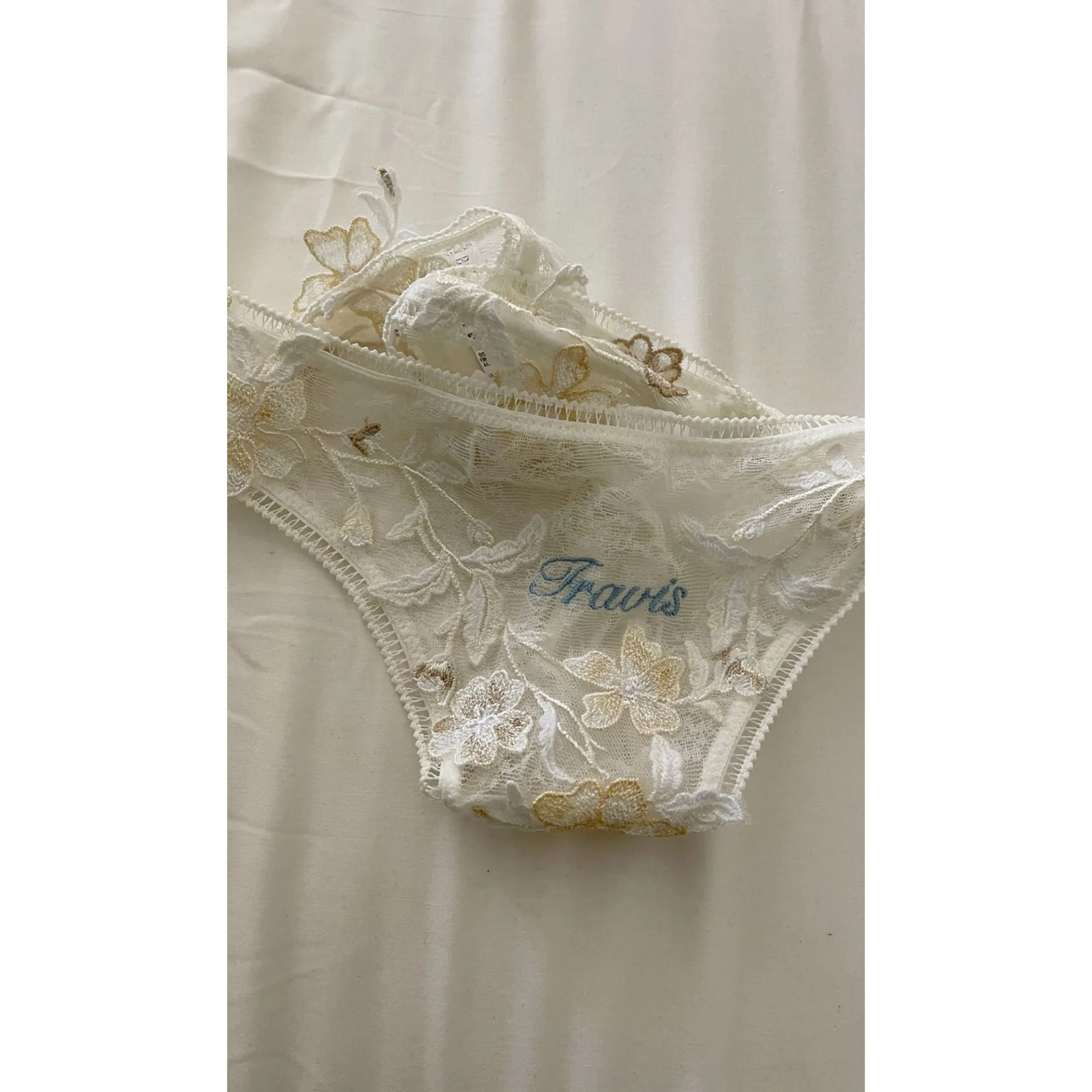 In June 2022, the famous drummer posted a photo via his Instagram Story of the Poosh founder’s white and gold, floral-adorned lingerie that said “Travis” at the center in blue lettering. The racy look came after the reality star said “I do” in a custom Dolce & Gabbana mini dress that featured a corset construction and was made of satin and lace.