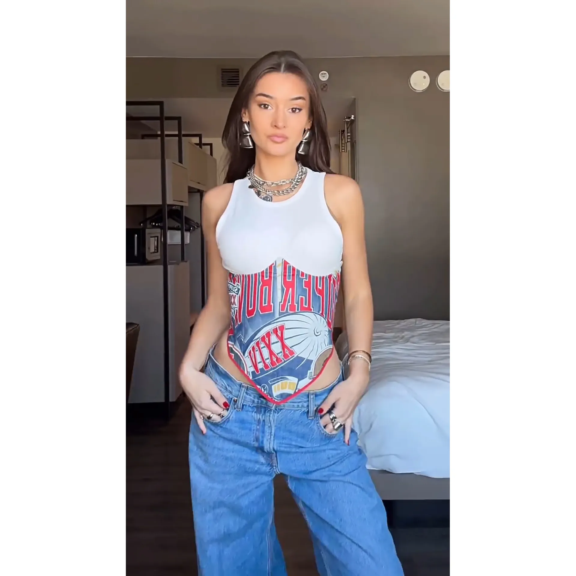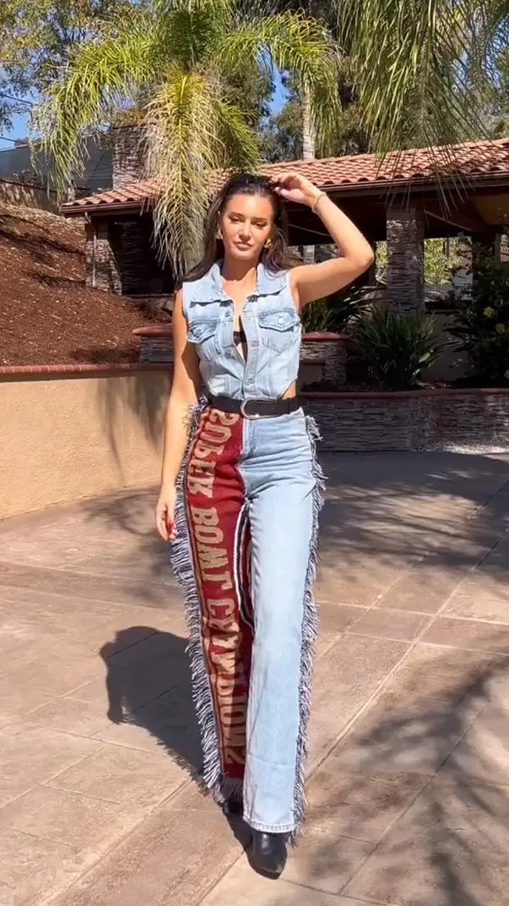 Kristin has transformed traditional NFL merch into chic corsets, flared miniskirts and even a puffer coat.