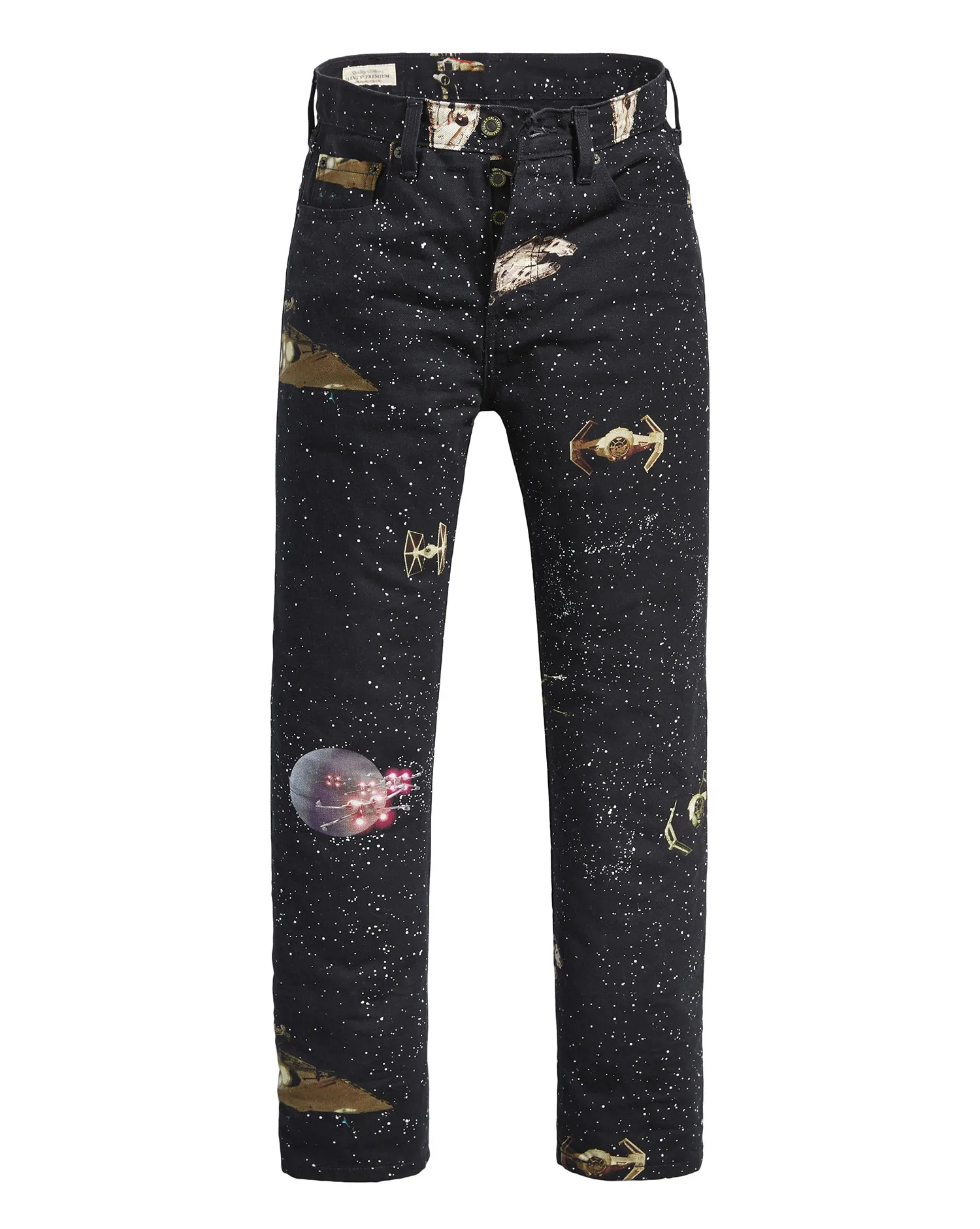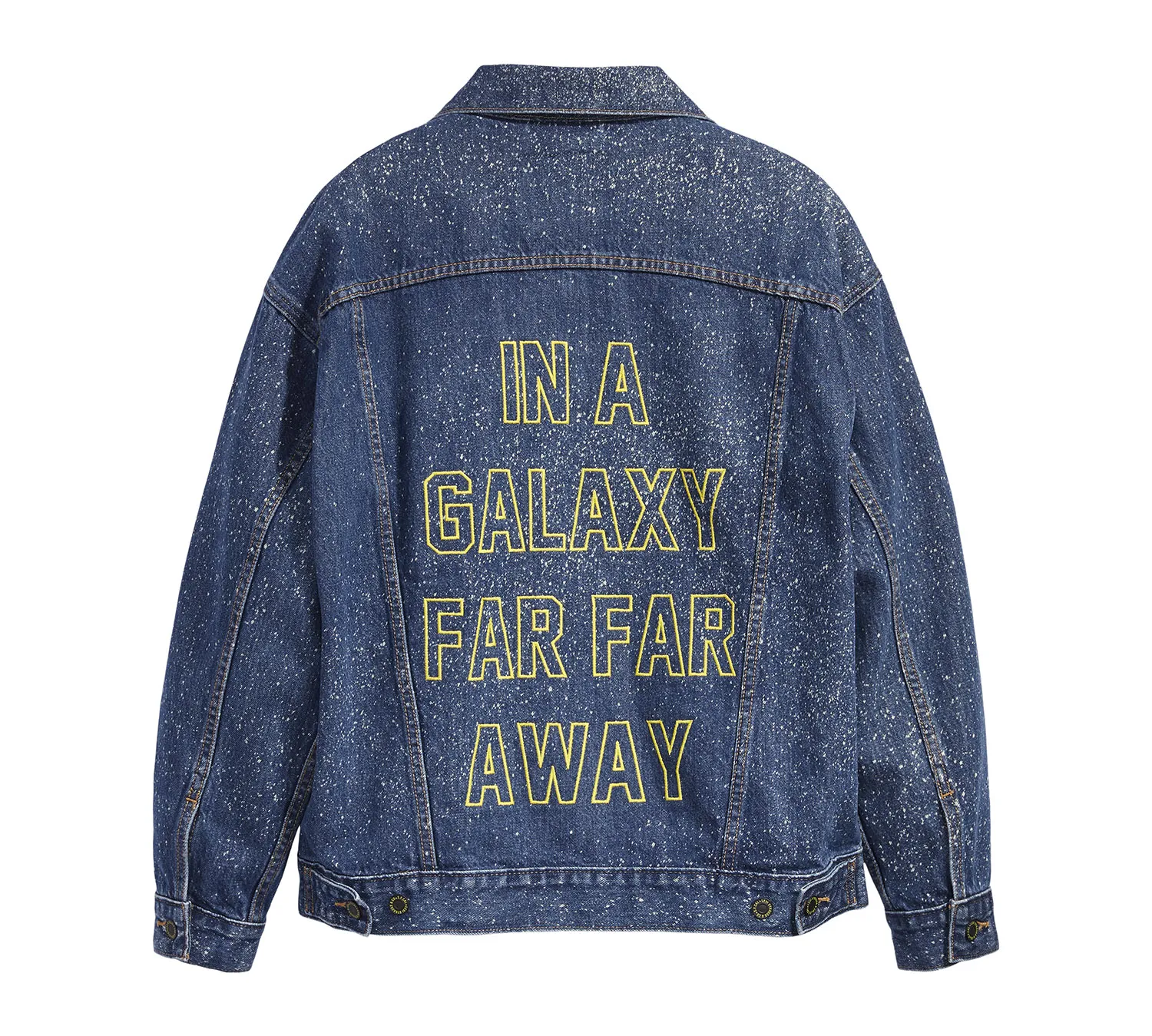 If you haven’t ditched us to check out the fun offerings already, the collection includes something for just about every fan. There are several vintage-inspired jean jackets with designs like R2-D2 on the back or sentimental quotes like the movie’s opening crawl: “In a galaxy far, far away…” There are also simple T-shirts featuring some of the franchise’s most memorable characters like Princess Leia and Darth Vadar — in addition to stylish galaxy jeans and the matching jacket to go with it.