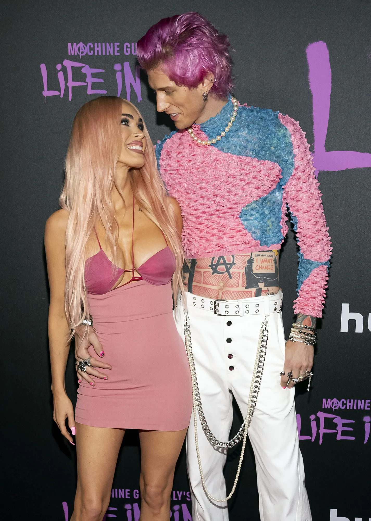 Fox, 36, debuted the fresh new ‘do at the premiere of fiancé Machine Gun Kelly‘s Hulu documentary, Life in Pink. To complement her newly dyed mane, she stepped out in a blush-colored mini dress by Nensi Dojaka. The frock featured a cutout bust and a figure-hugging skirt. The Jennifer’s Body star finalized the look with strappy pink sandal heels, giving the ensemble a monochrome finish. For her glam, Fox sported pale pink nails and a soft pink lip.