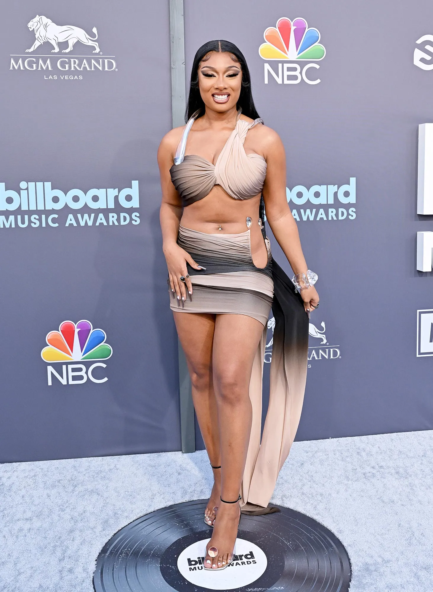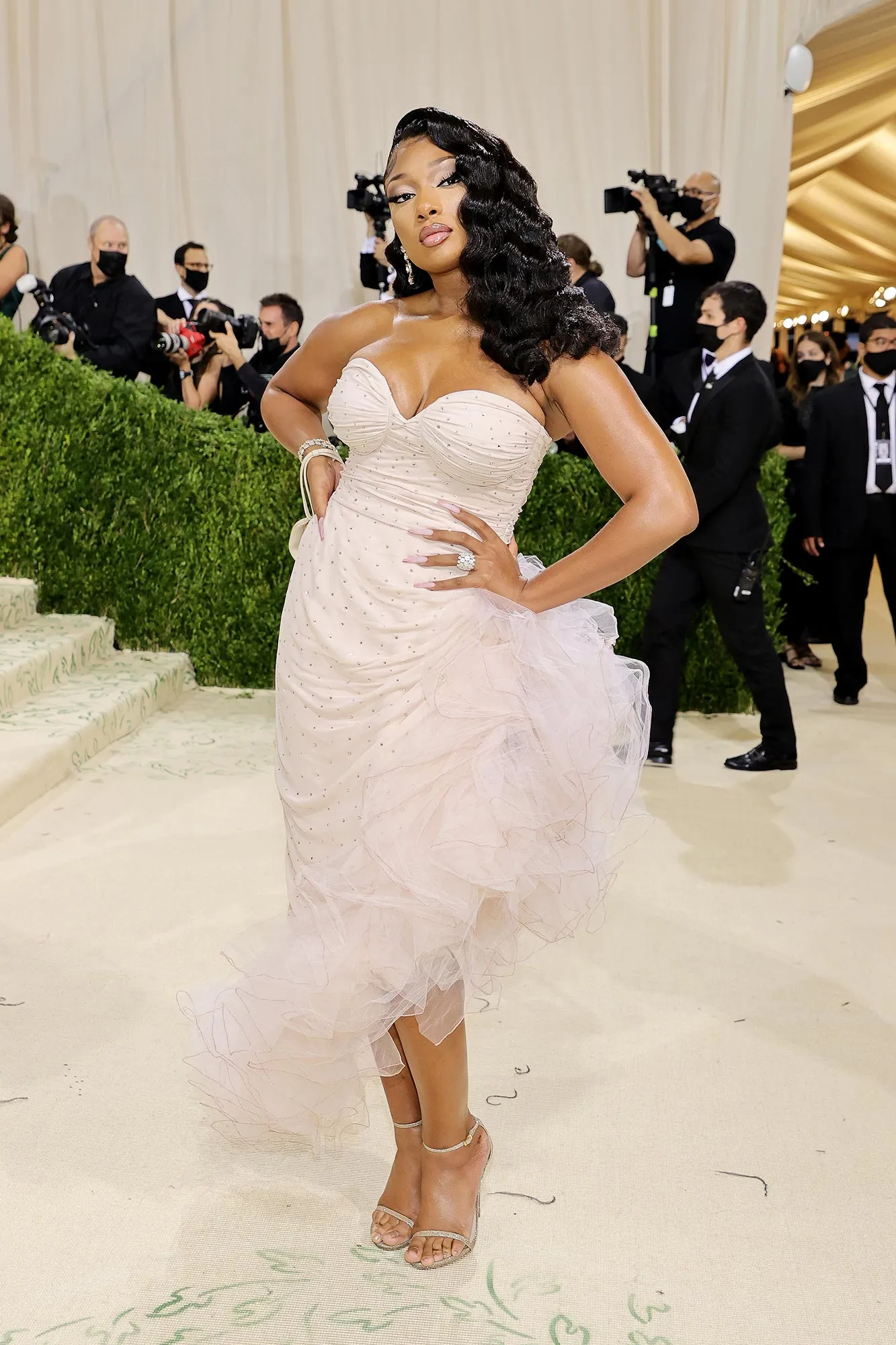 Another standout style moment from Megan came at the 2022 Met Gala. She looked angelic in a gold-embellished gown by Moschino, which featured feathered shoulder pads made to look like wings. The dress was completed with mesh fabric on the bodice, a thigh-high slit and a cascading train. For glam, the hip hop star rocked metallic eye shadow and wore her hair in a sleek coiffure.