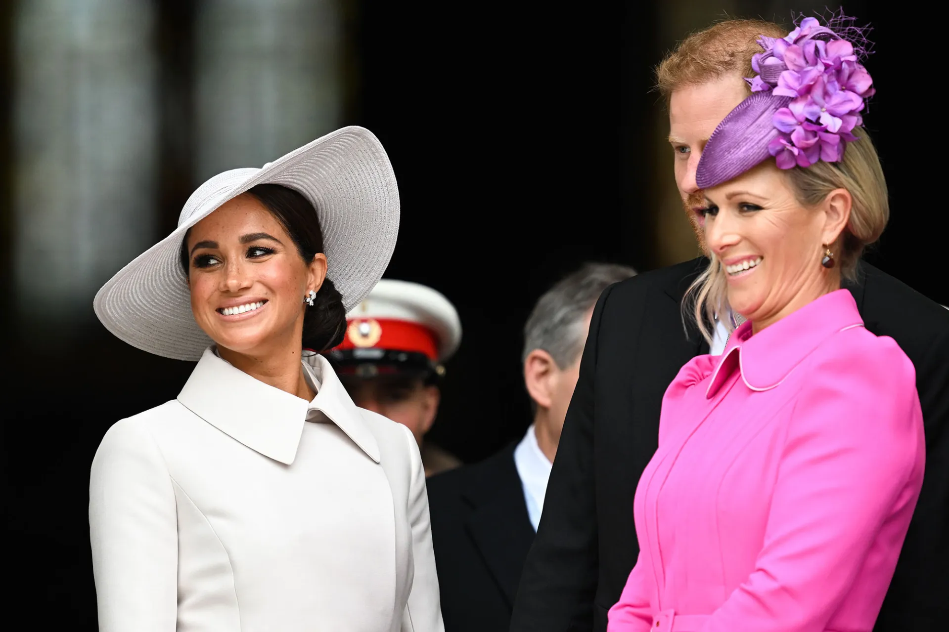 At the event, Meghan and Harry flashed wide smiles inside and outside of the chapel. Following the service, the duo were spotted gleefully chatting with fellow royals Peter Phillips and Zara Tindall as well as members of the clergy.