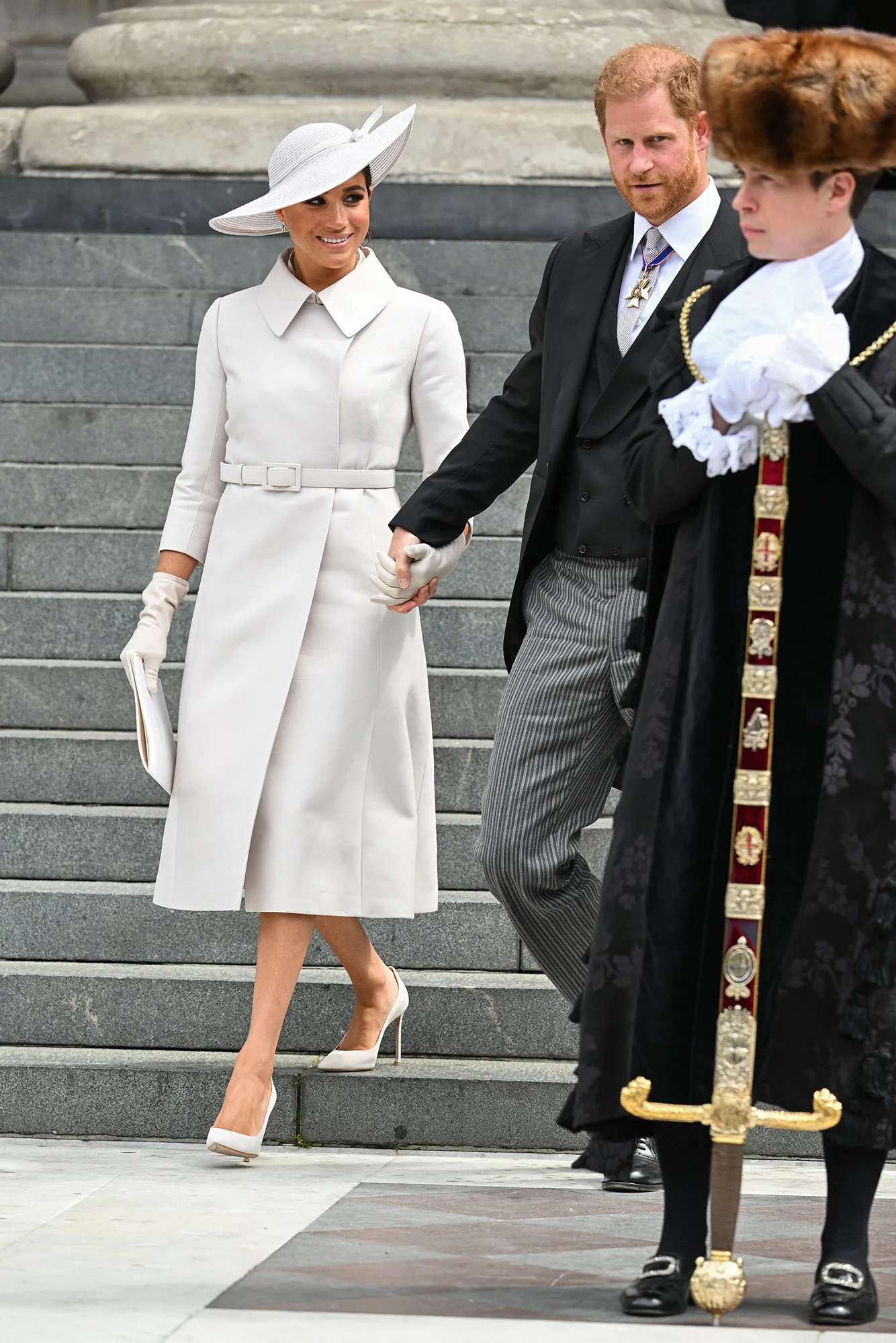 On Friday, June 3, the couple were spotted walking hand in hand to the Service of Thanksgiving at St. Paul’s Cathedral. For the outing, Meghan, 40, dazzled in a white trench coat and skirt designed by by Maria Grazia Chiuri for Dior. She paired the crisp look with a wide-brimmed ivory hat — also from the French fashion house by Stephen Jones. The California native completed her ensemble with Dior gloves and pointed-toe pumps. As for her glam, the former Suits actress opted for a side-swept updo and accessorized with dainty diamond earrings. For his part, Harry, 37, looked dapper in a black tailcoat jacket and pinstriped pants.