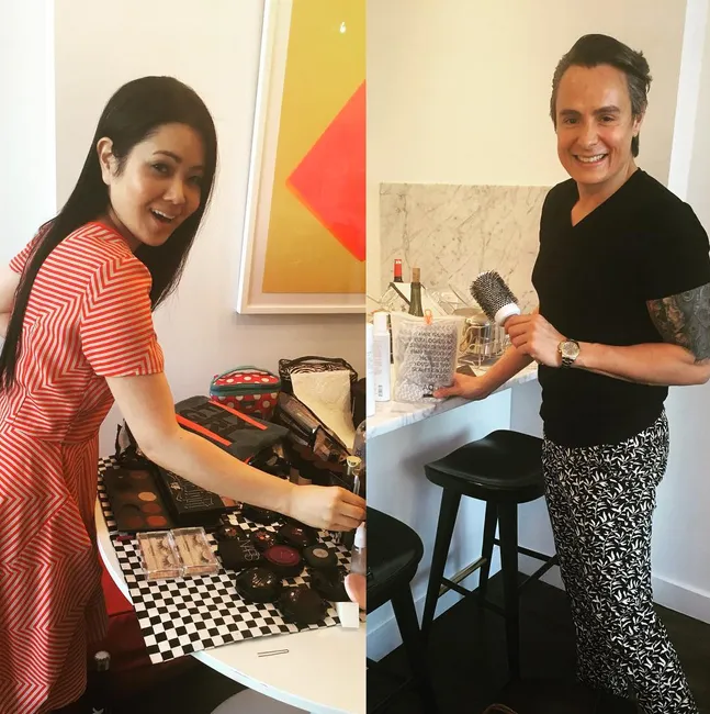 The Mindy Project star shared a snap of her hairstylist Marc Mena, who used AQUIS and evo products to create her chic bun, and makeup artist Janice Kinjo before the big event.
