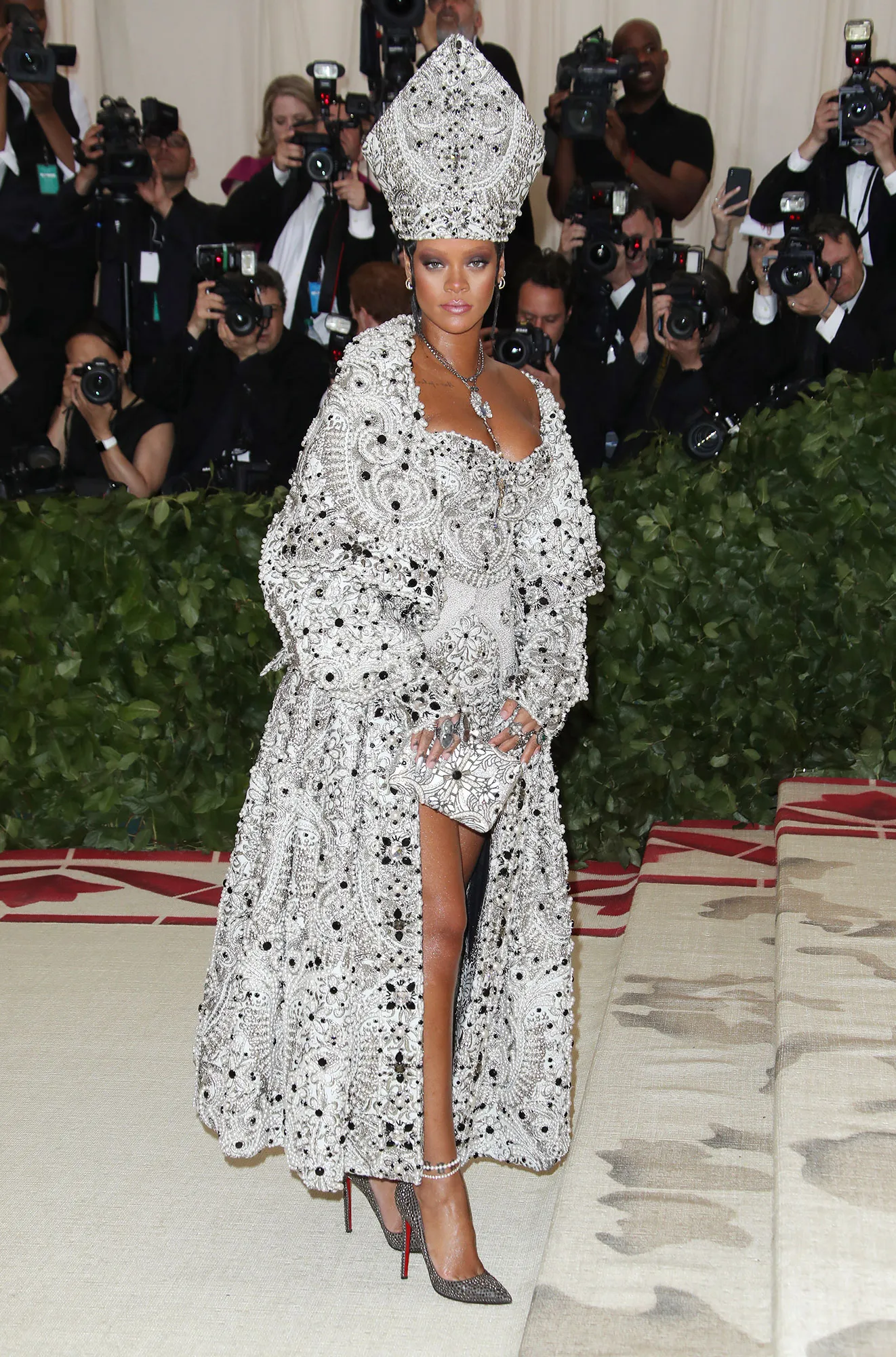 From there, the Fenty x Savage designer embraced doing the absolute most for each Met Ball theme. When the “Heavenly Bodies: Fashion and the Catholic Church” theme was set for 2018, Rihanna rolled up looking like the pope of fashion.