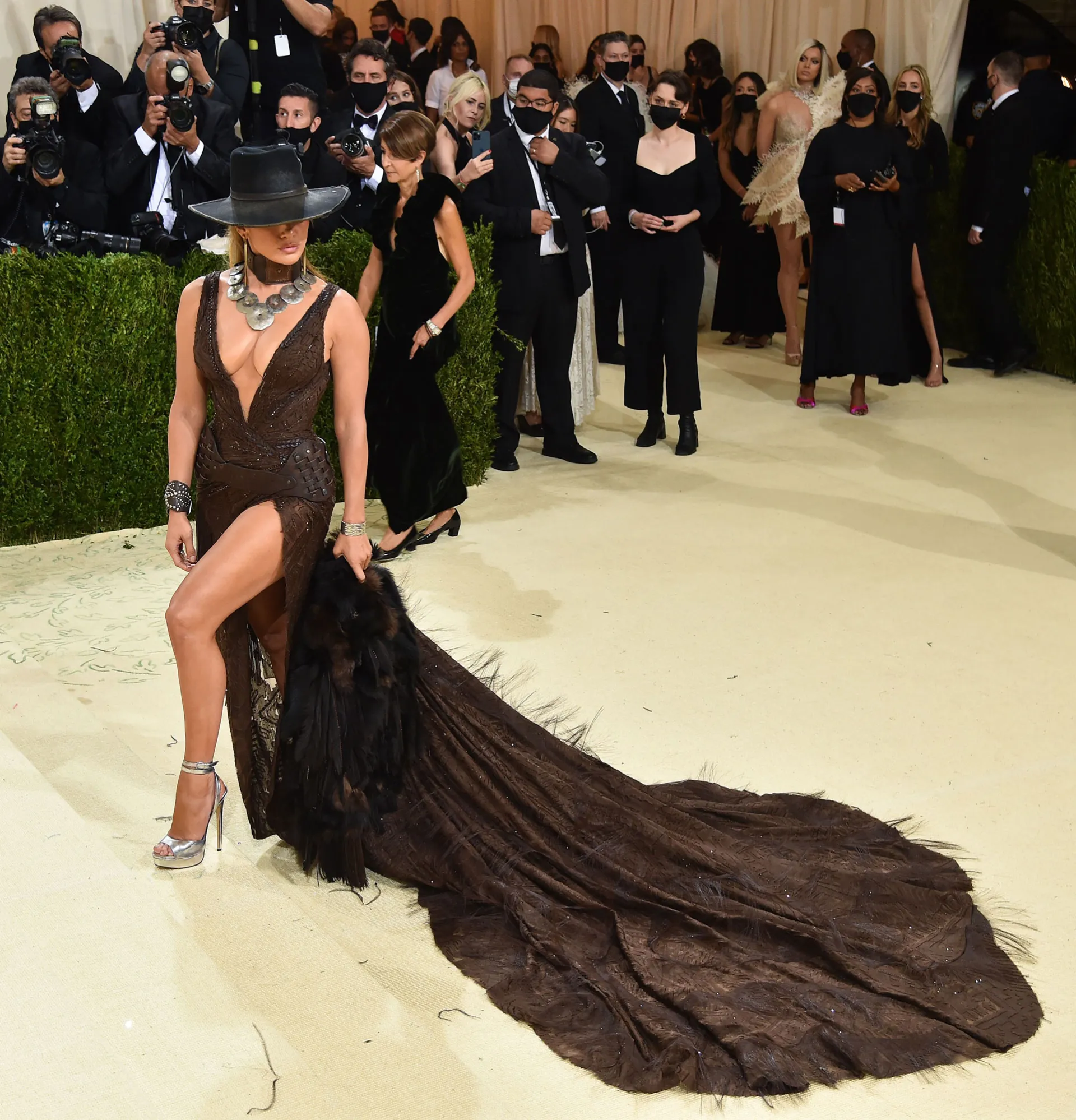 Lopez, 52, donned a floor-length Ralph Lauren gown — complete with a daring, thigh-high slit — at the Metropolitan Museum of Art in New York City on Monday, September 13. To fit the “In America: A Lexicon of Fashion” theme, she accessorized with a western-inspired hat and faux fur shrug.
