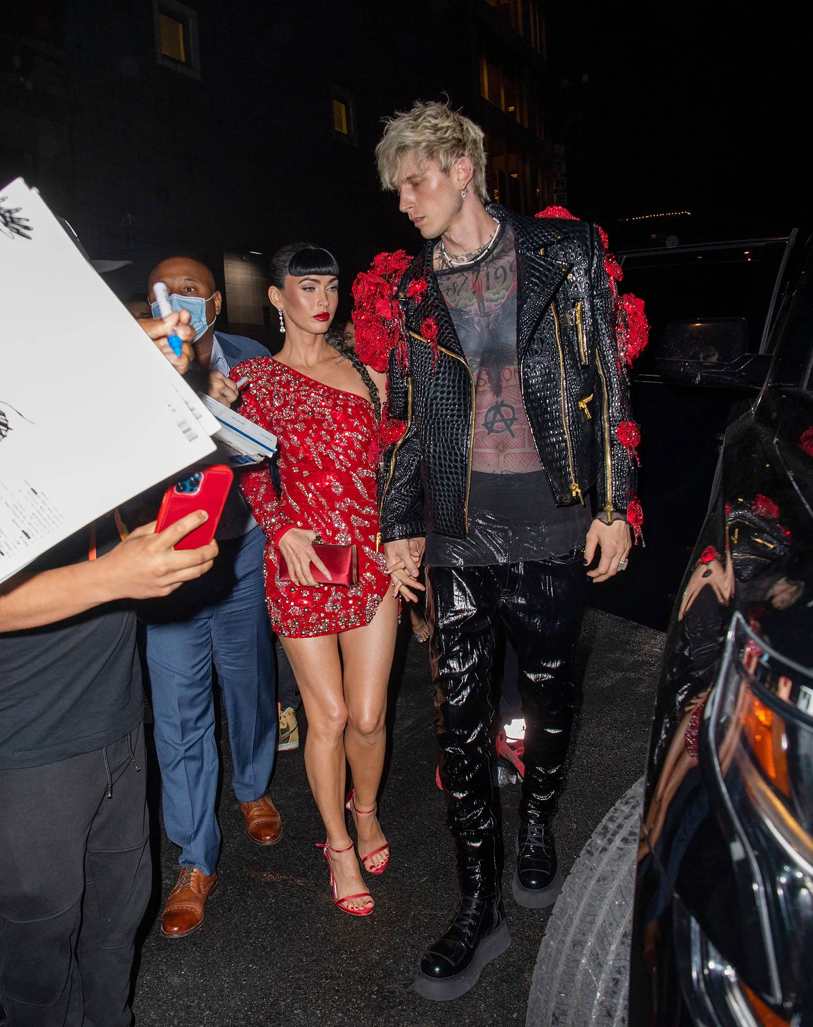 The Transformers star, 35, and the rapper, 31, held hands to an afterparty at the Cathédrale restaurant in New York City. While Fox rocked a red, one-shoulder studded mini dress, Kelly donned a black sheer shirt with a black leather jacket. The sleeve of the jacket was embellished with red jeweled roses, perfectly matching his girlfriend’s look.