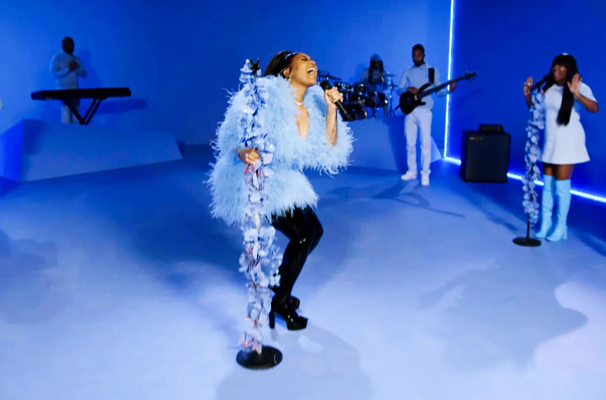 One of our favorite looks of the evening though simply made a statement on stage. Jazmine Sullivan, who performed at the event, stunned in a blue feathery number. She paired the retro-style getup with a diamond choker and floral necklace.