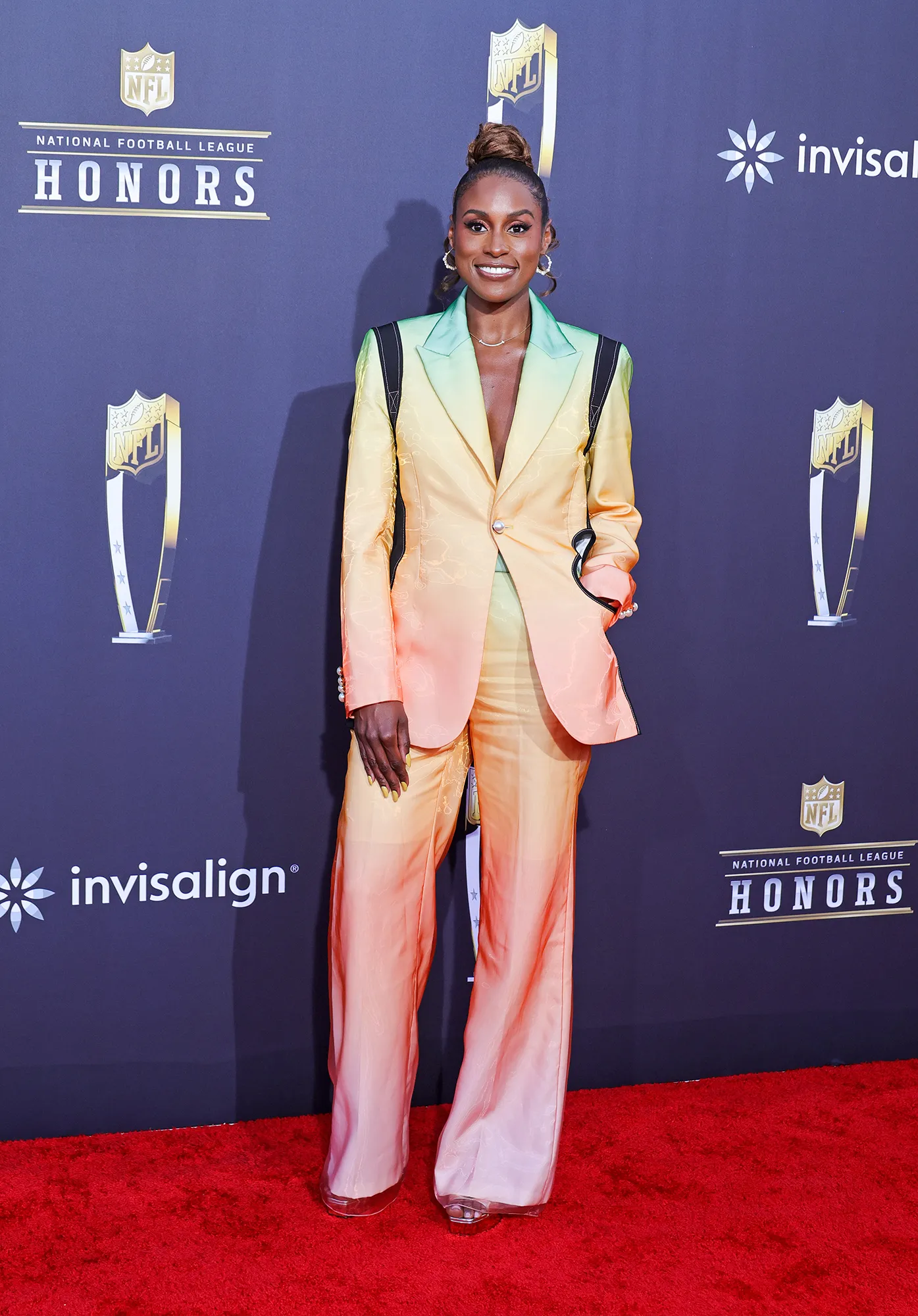 Rae, who starred in Barbie, was a standout in a rainbow colored jacket and ombré pants. Her vibrant blazer was finished with pearl buttons as she accessorized with a dainty silver necklace and hoop earrings. For glam, Rae stunned with shimmery eyeshadow and a slicked back bun.