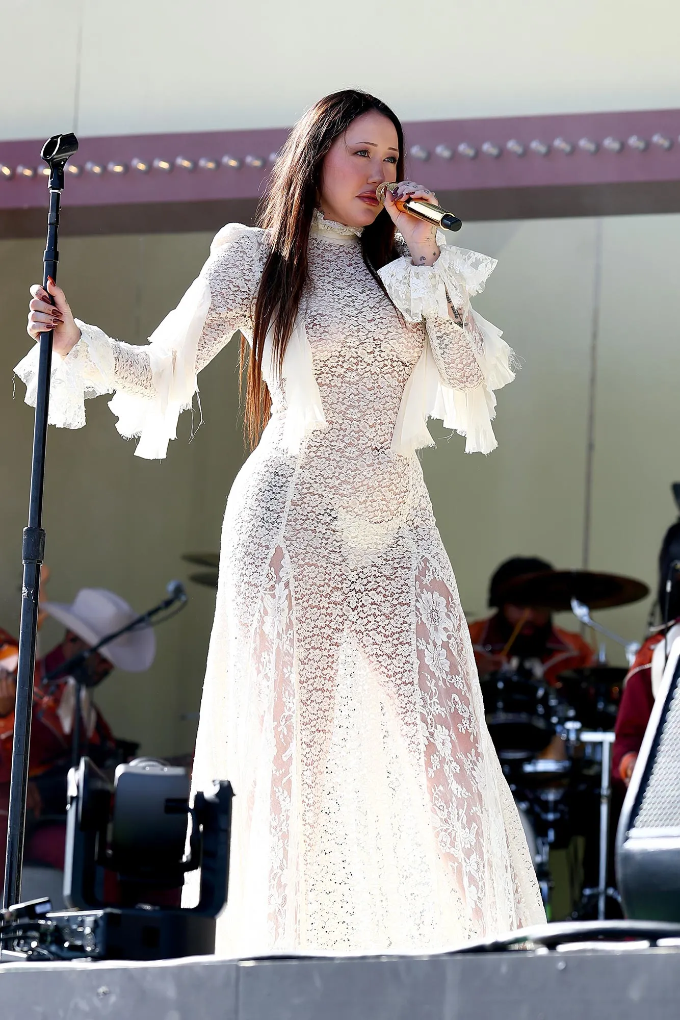 She had a similar outfit that same month, when she surprised fans at Coachella and hopped on stage with Shaboozey. For their show, she slayed in a white lace Dilara Findikoglu dress that hugged her curves. She teamed the look with white G-string panties that showed underneath her dress.