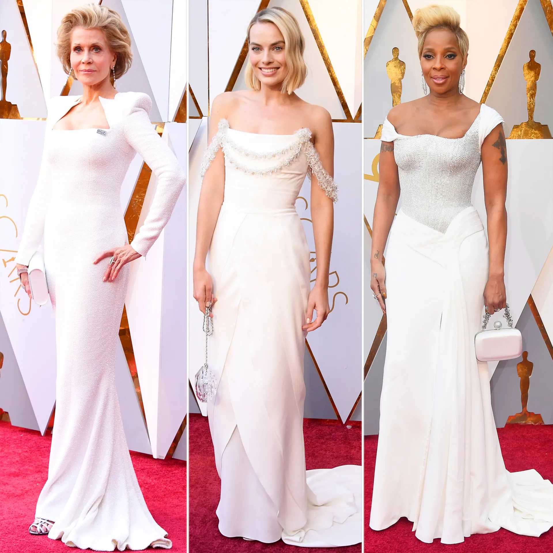 While the Time’s Up movement wasn’t as sartorially prominent on the Oscars red carpet, stars like Jane Fonda in Balmain, Margot Robbie in Chanel Haute Couture and Mary J. Blige in Versace made a seemingly feminist statement in their suffragette white gowns.