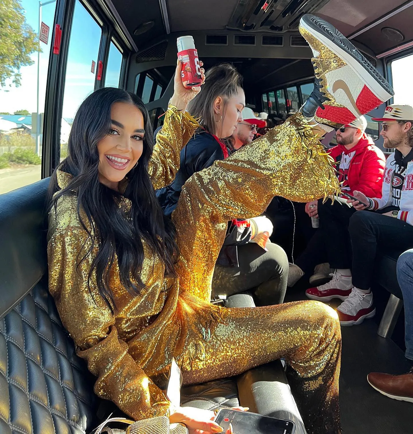 One of her most standout looks came in January 2023 when she sported an all-gold getup equipped with sequins and tinsel embellishments at the 49ers game against the Dallas Cowboys. Claire added even more glitter with sparkly sneakers and shimmery glam.
