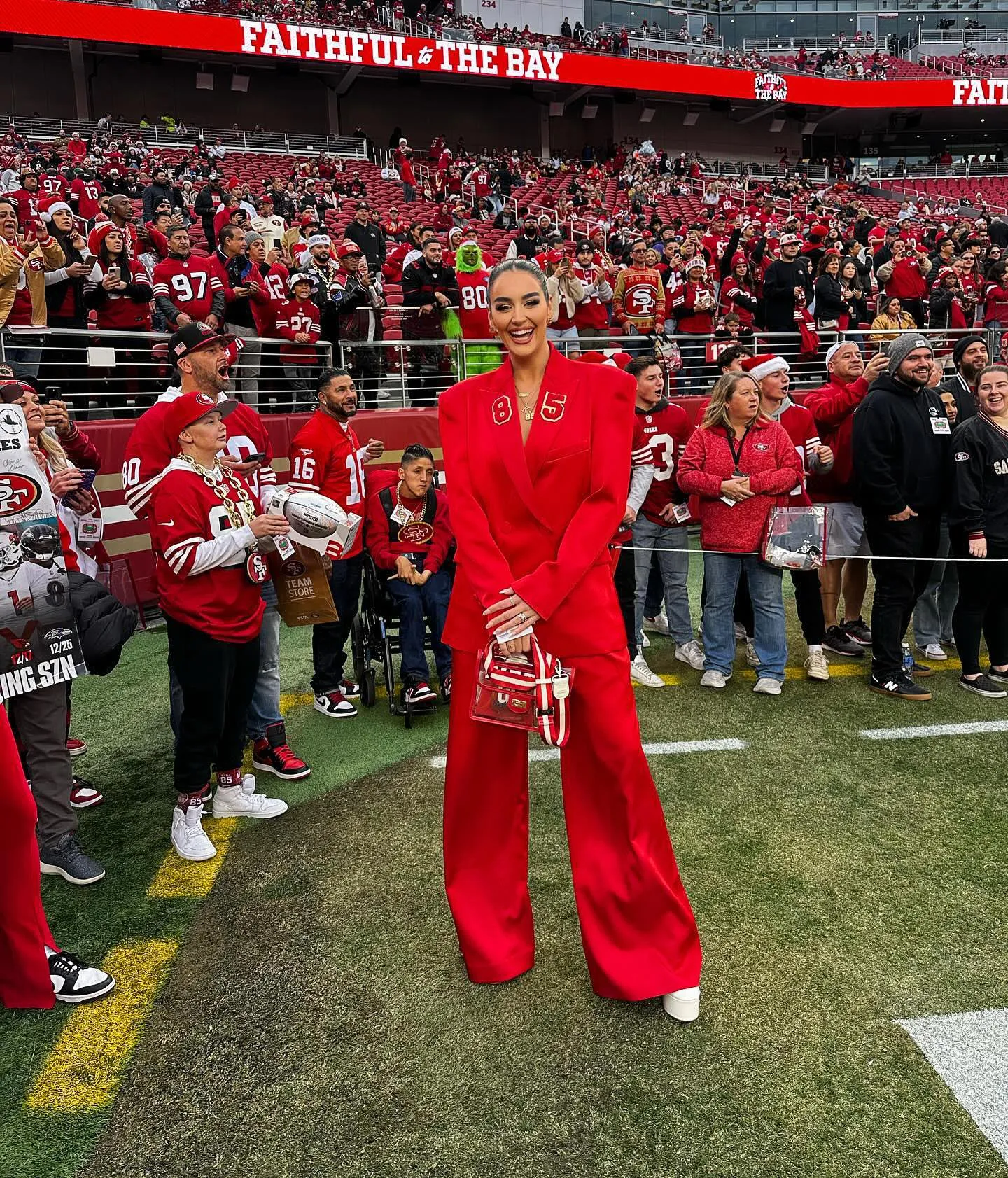 Claire never misses an opportunity to look fly in fabulous fits while cheering on husband George Kittle, a tight end for the San Francisco 49ers. From bedazzled sets to glittery jersey dresses and vibrant suits plus graffiti-clad outfits, Claire does it all.