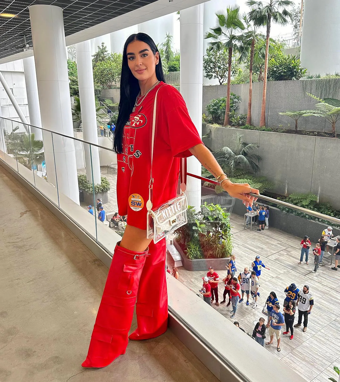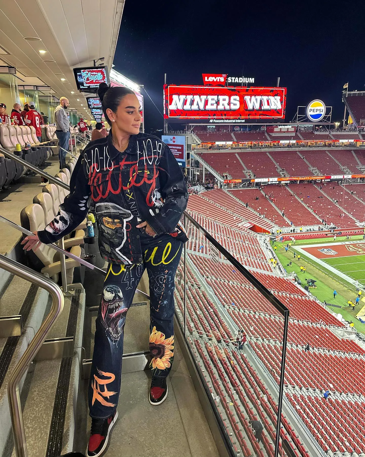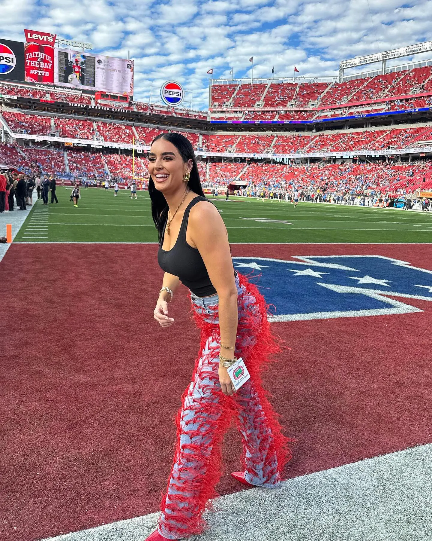 Another standout look from Claire came in January 2024 at the 49ers vs. Detroit Lions game. She rocked a black tank top with feather-adorned jeans, bright red heels and gold jewelry. Her hair was parted down the middle and worn straightened teamed with makeup that included chrome eyeshadow and long lashes.