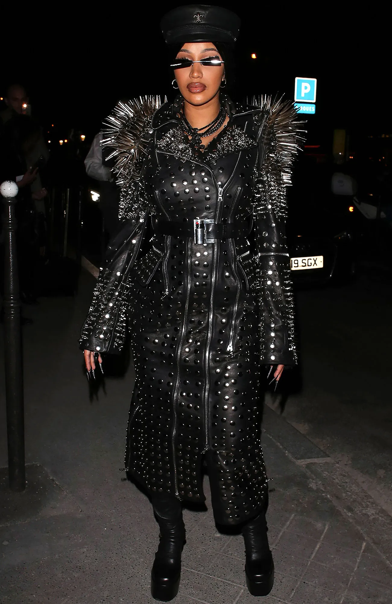 On Thursday, September 30, the star was spotted leaving her hotel in a Richard Quinn trench coat with studs and spikes galore. The leather number was cinched at the waist and had a slew of zipper embellishments. The “Bodak Yellow” rapper paired the coat with platform boots, a conductor’s hat and square frame sunglasses.