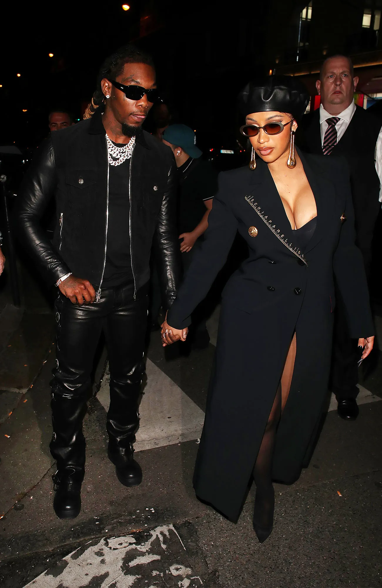 One day prior, Cardi stepped out with Offset in two Schiaparelli ensembles. For date night, she opted for a sleek look, wearing a sophisticated black and gold coat, sheer tights and leather beret.
